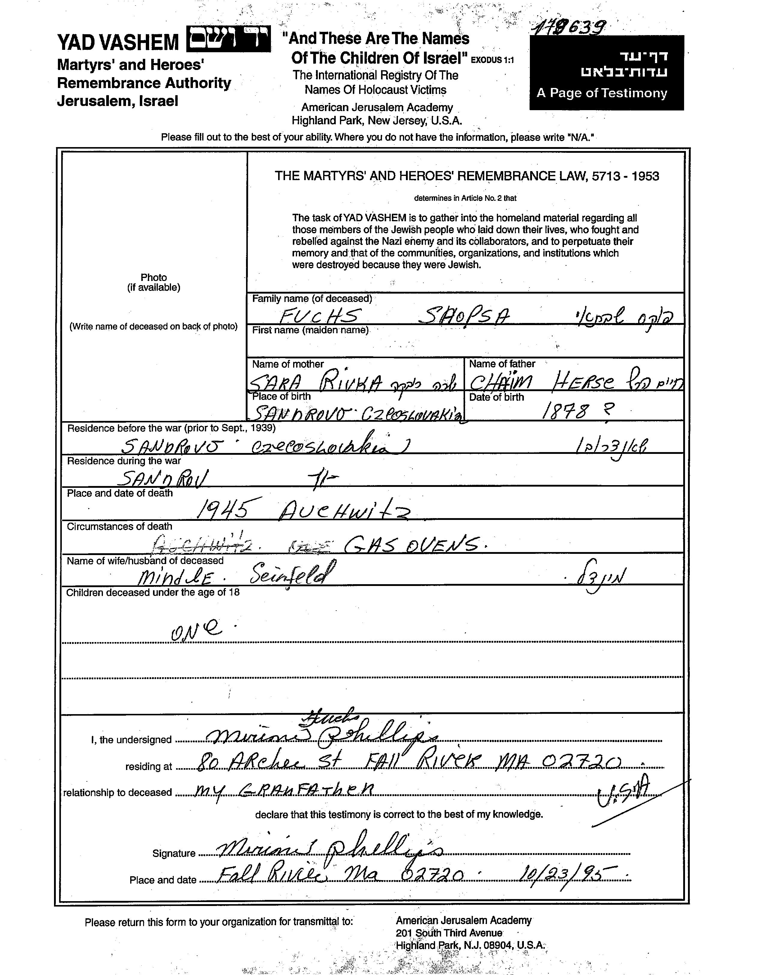 Фукс Шабтай 1878 Шандрово, Чехословакия Лист свидетельских показаний