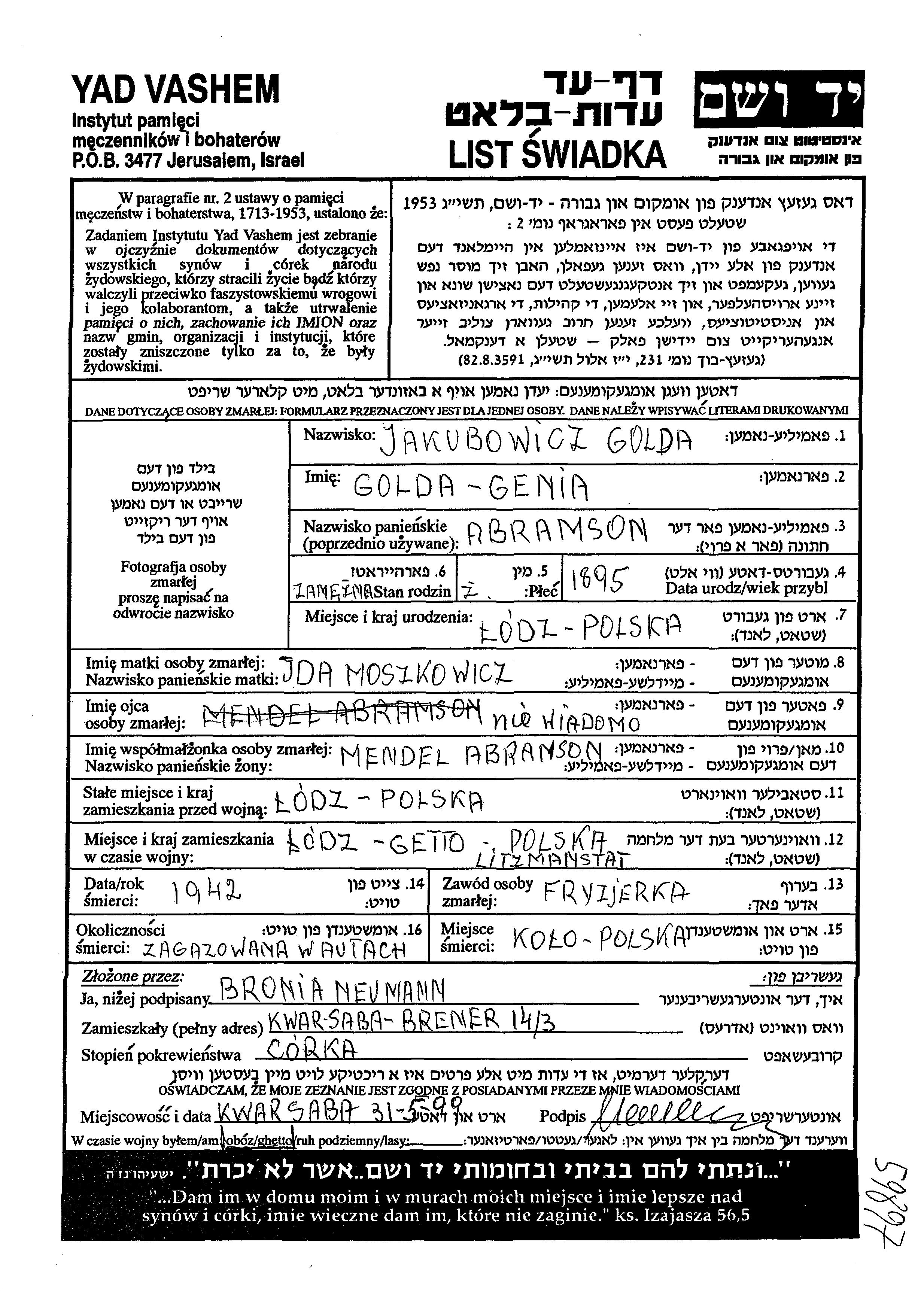 Якубович Голда Геня 1895 Лодзь, Польша Лист свидетельских показаний