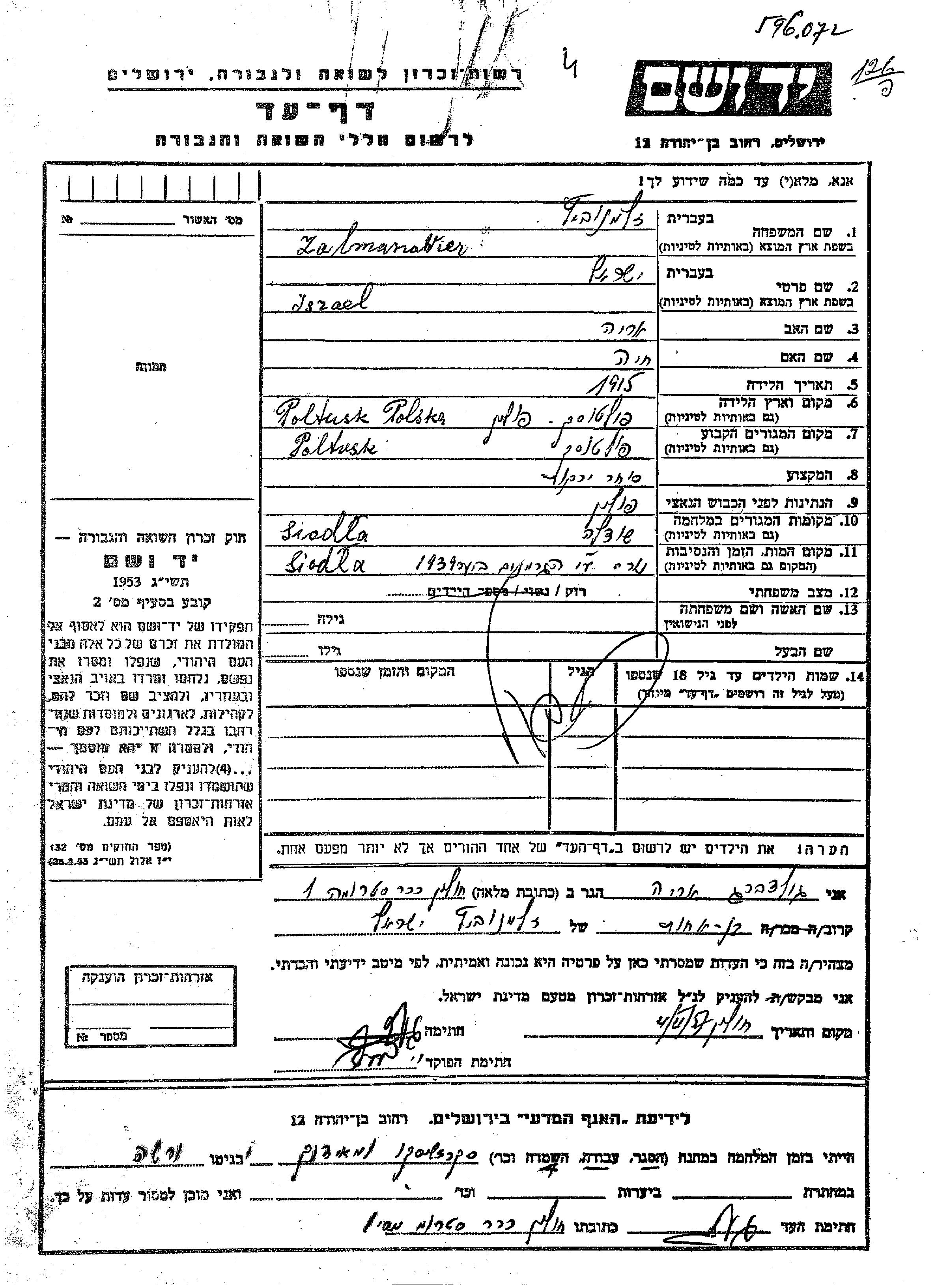 | Зальманович | Исраэль | 1915 | Пултуск, Польша | Лист свидетельских показаний |