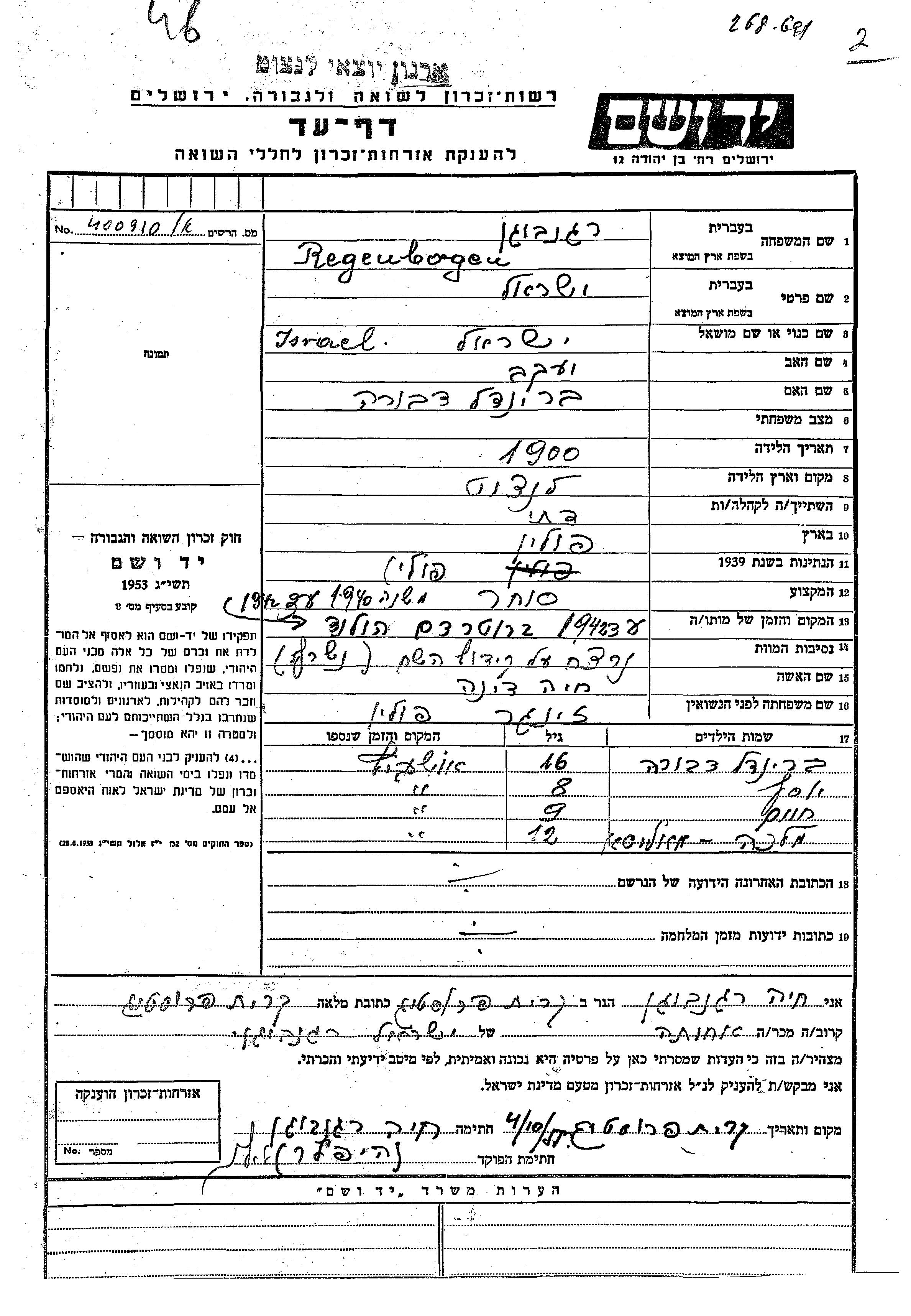 Исраэль Регенбоген, место рождения: Ланьцут, Польша. Торговец / торговка. Место жительства до войны: Польша.