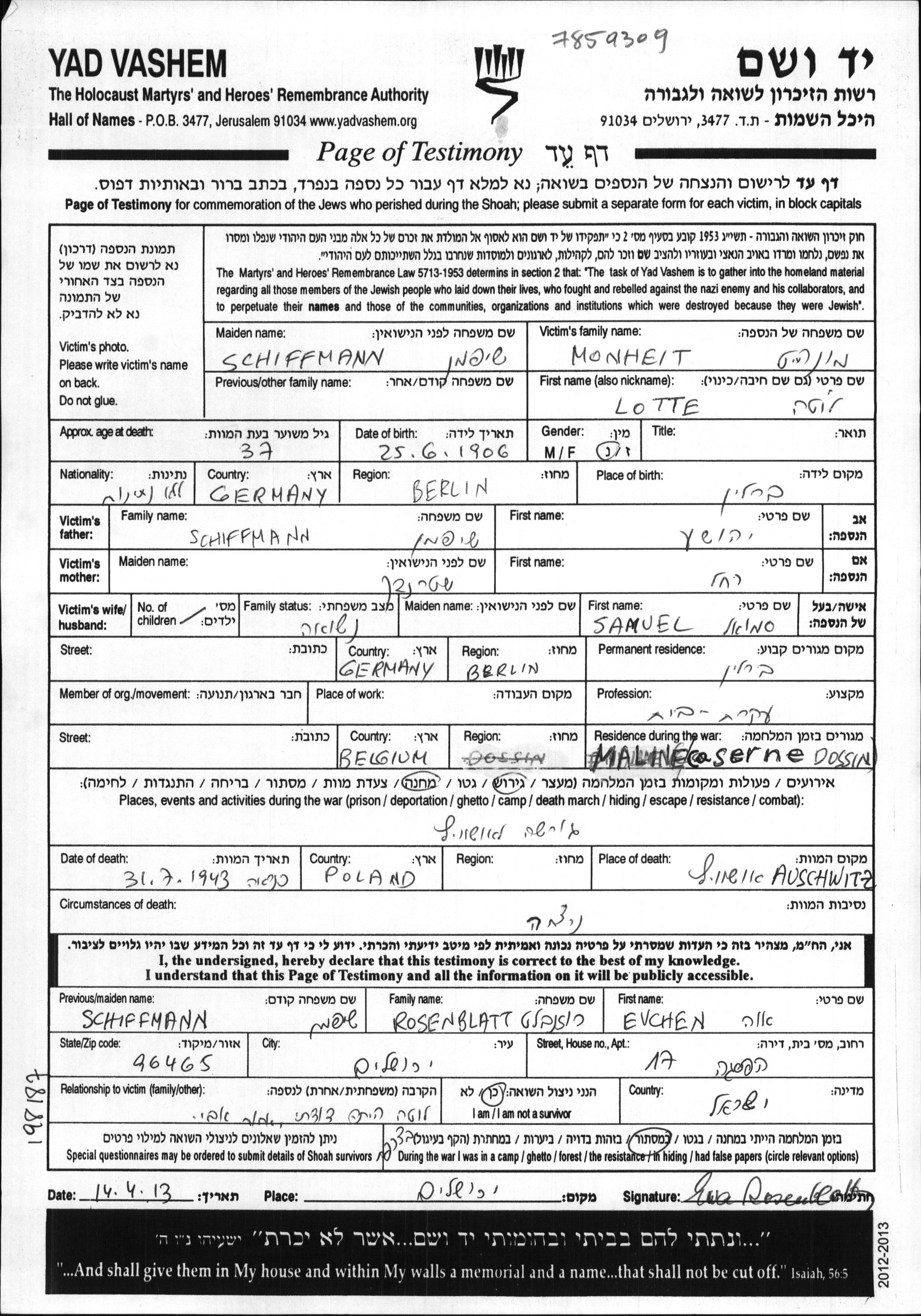 Лоте Монхейт, девичья фамилия Шиффманн, место рождения: Берлин, Германия. Домохозяйка. Место жительства до войны: Берлин, Германия.