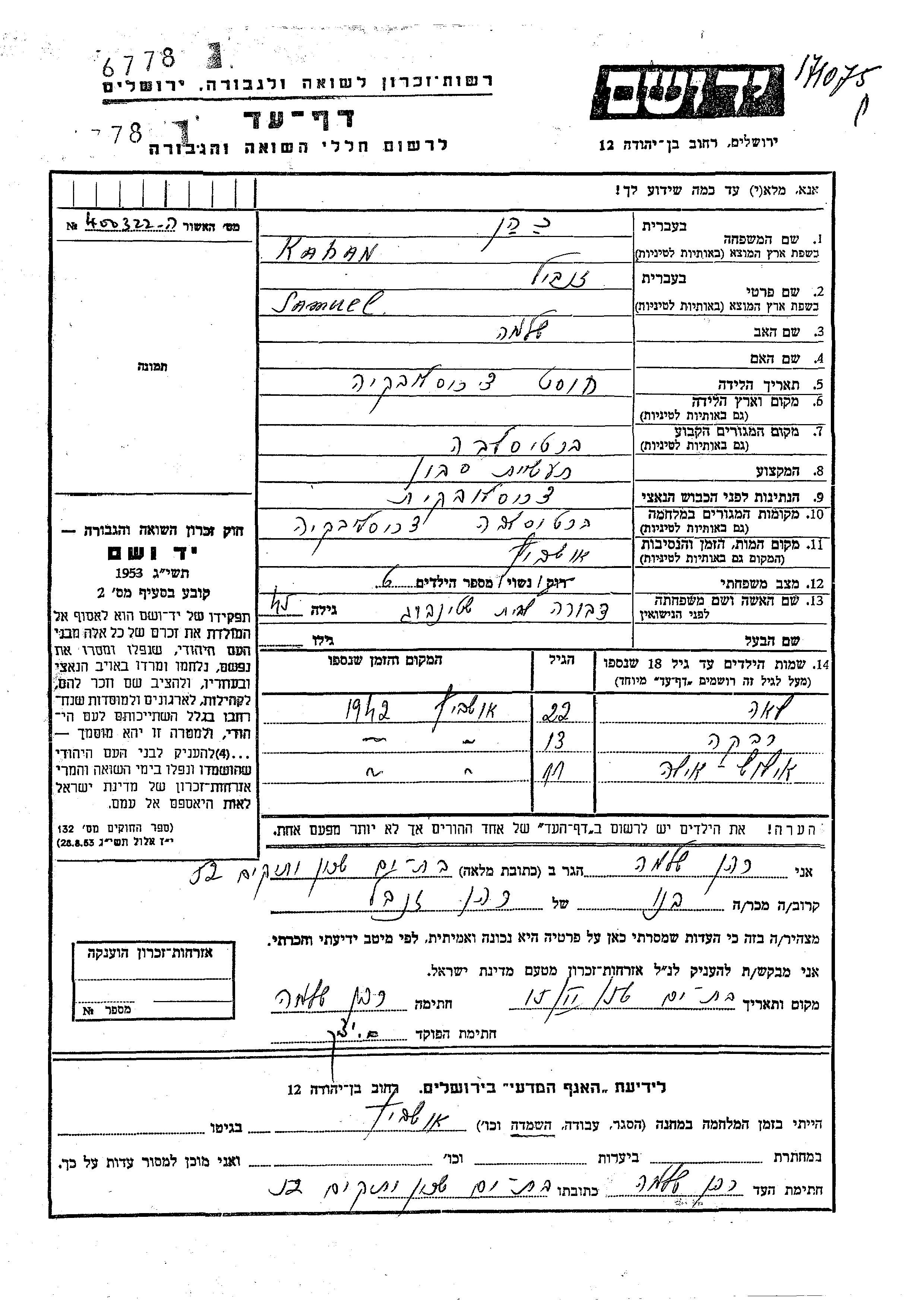 Хаим Занвиль Кахан, место рождения: Хуст, Чехословакия. Торговец / торговка. Место жительства до войны: Братислава, Чехословакия.