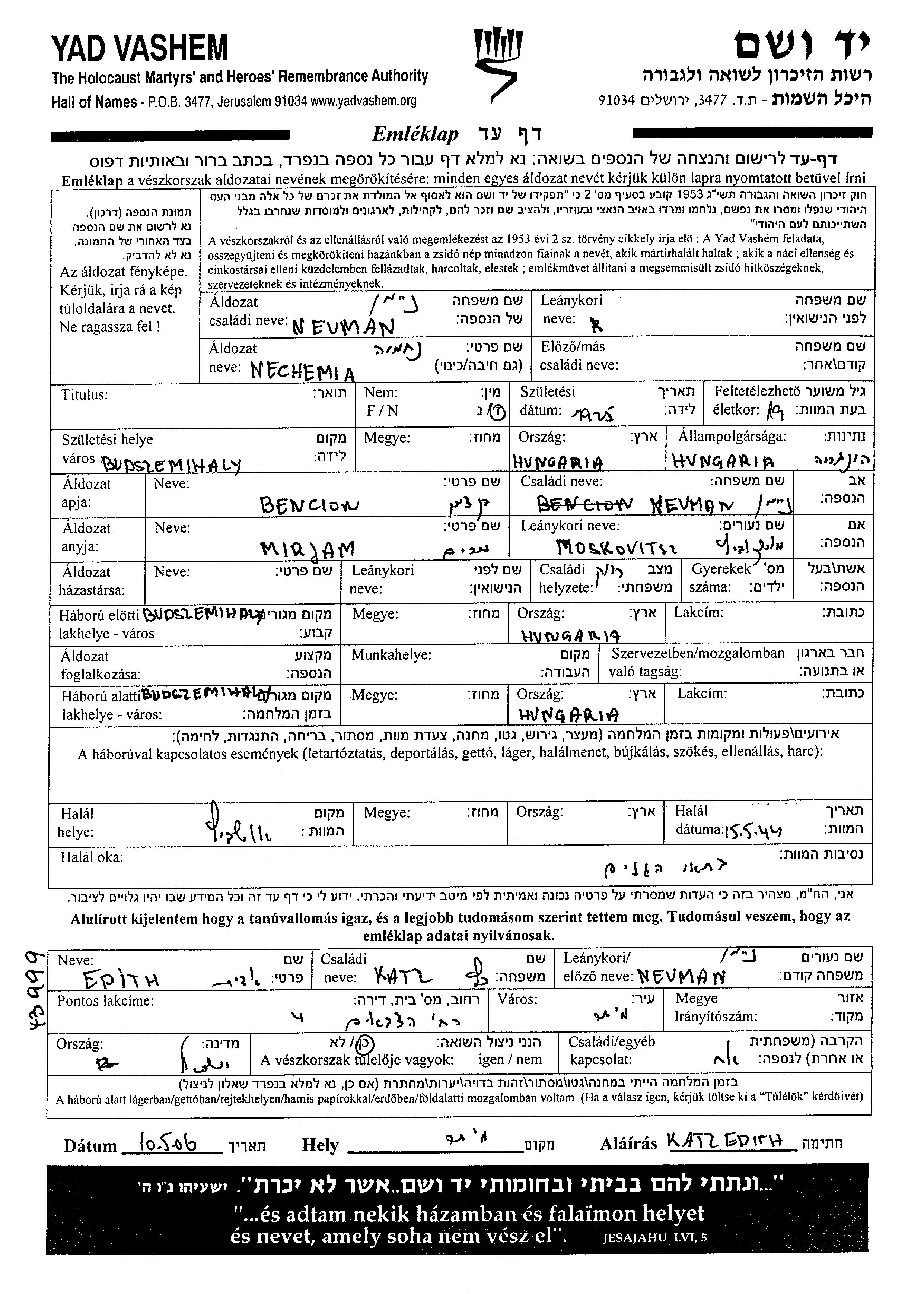 Нойман Ниман Нехемия 1925 Будсентмихай, Венгрия Лист свидетельских показаний