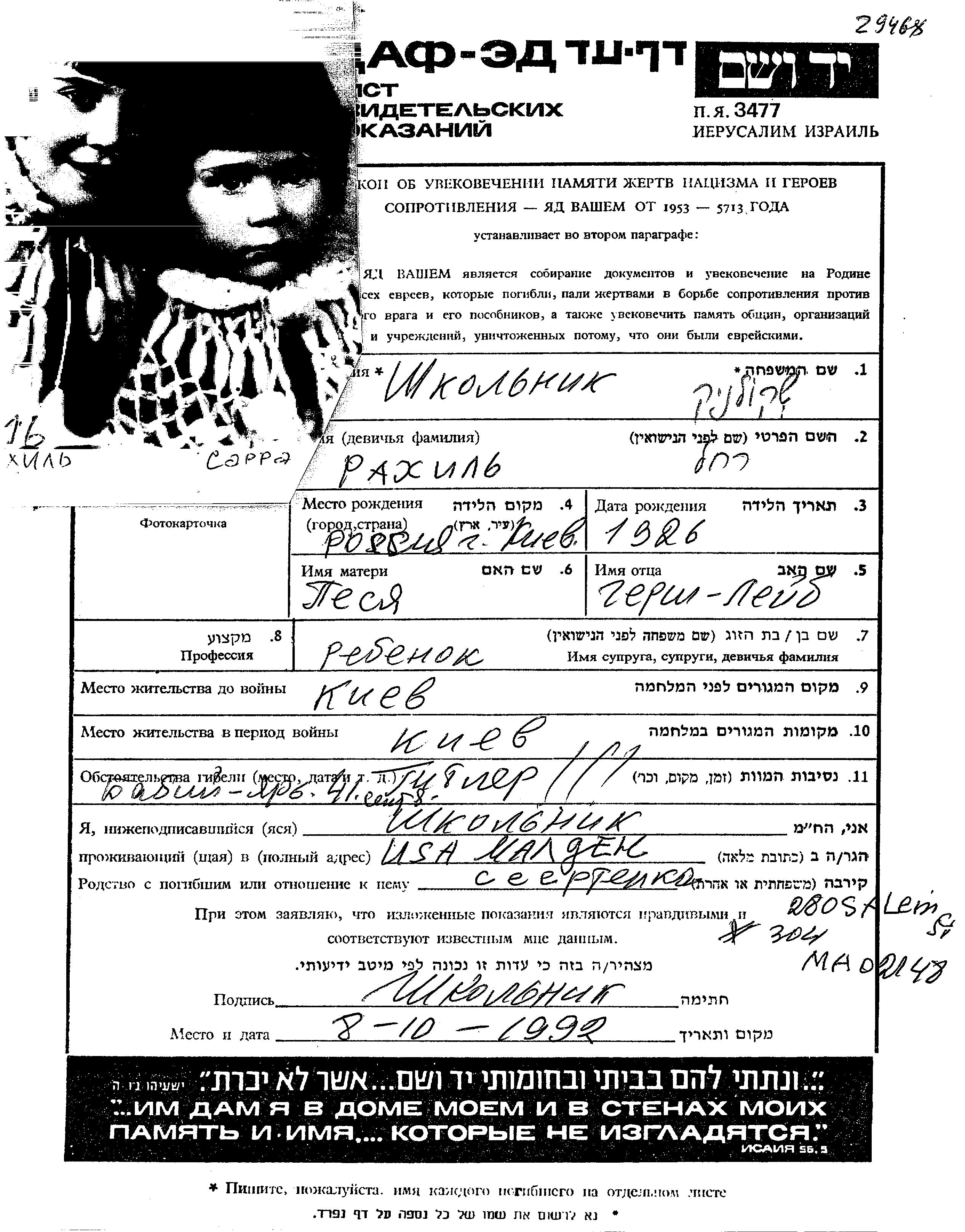 Школьник Рахиль 1926 Киев, Украина (СССР) Лист свидетельских показаний