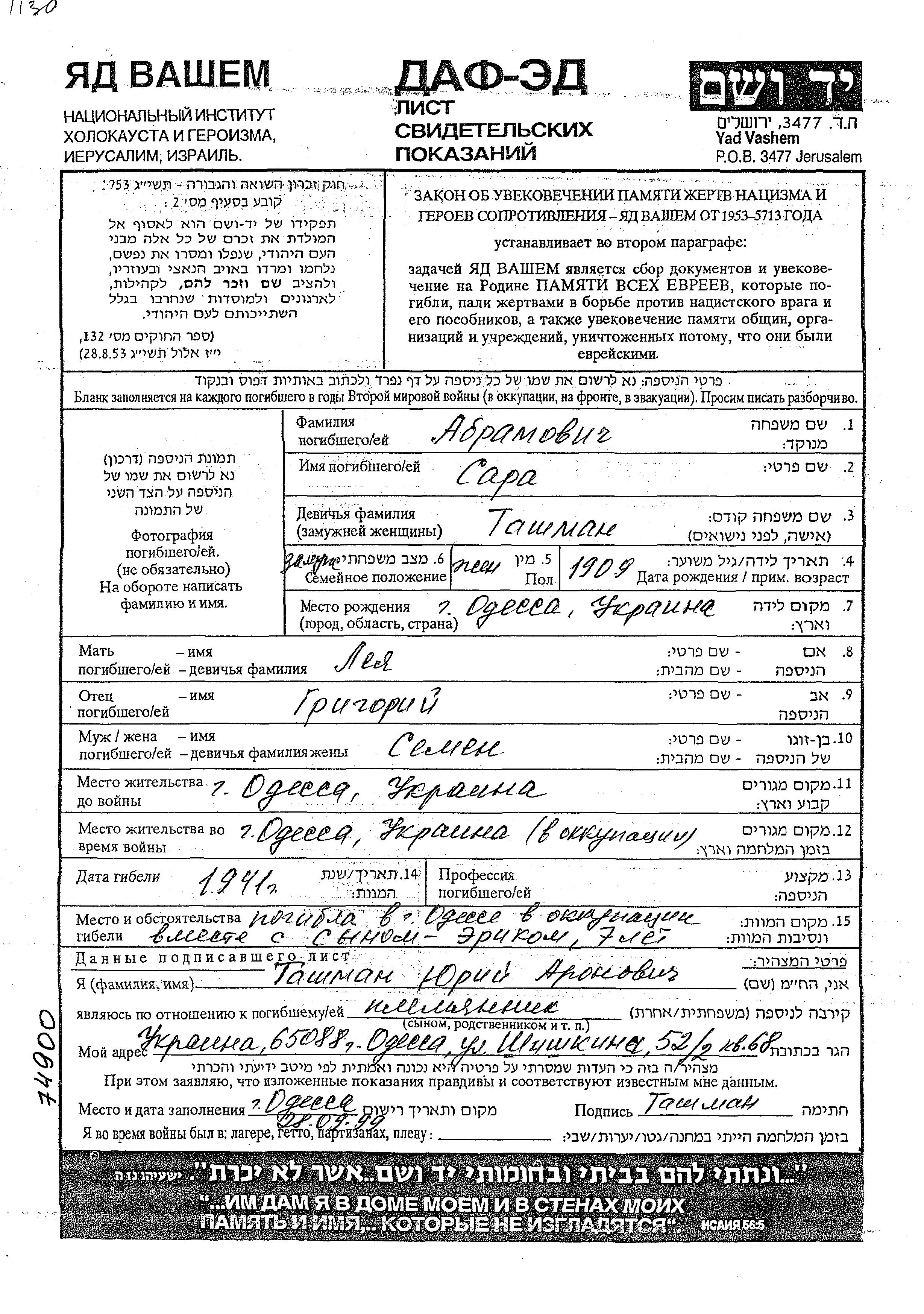 Абрамович Сара 1909 Одесса, Украина (СССР) Лист свидетельских показаний