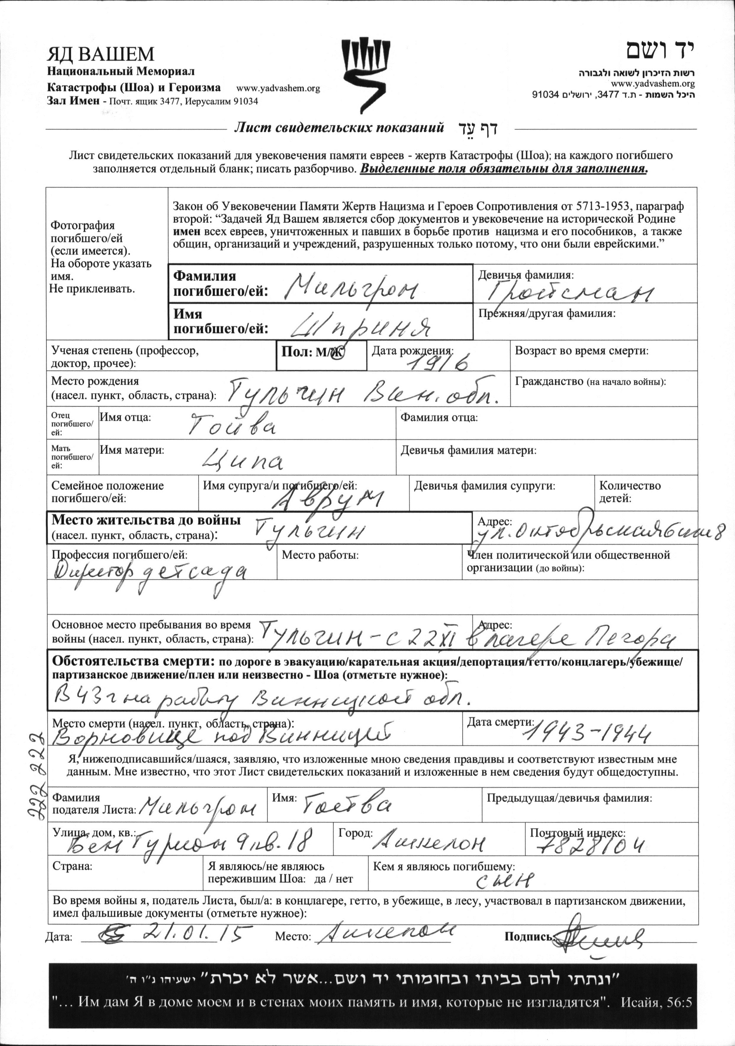 Мильгрон | Шприня | 1916 | Тульчин, Украина (СССР) | Лист свидетельских показаний |