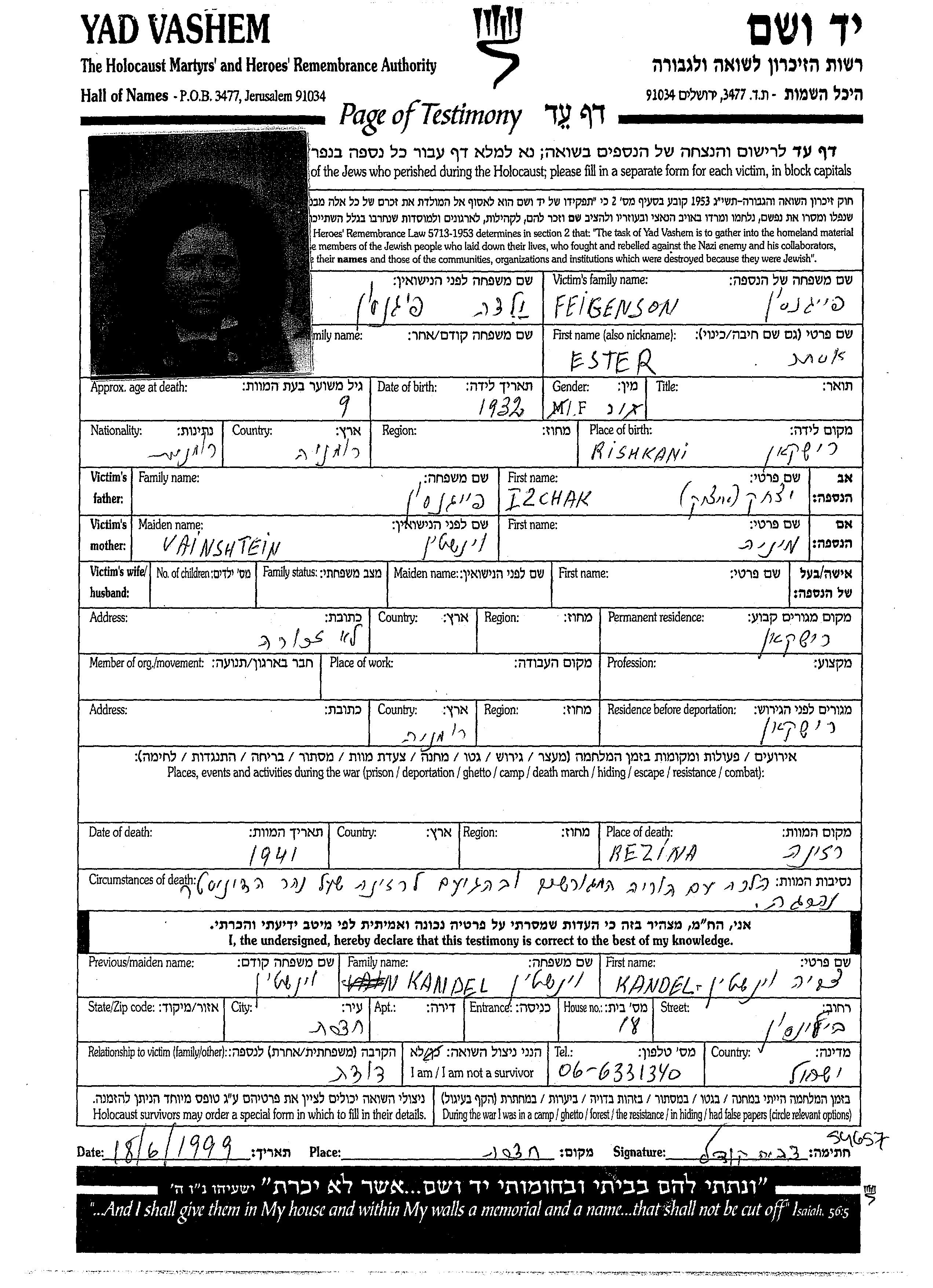 Фейгенсон Эстер 1932 Ришкан, Румыния Лист свидетельских показаний