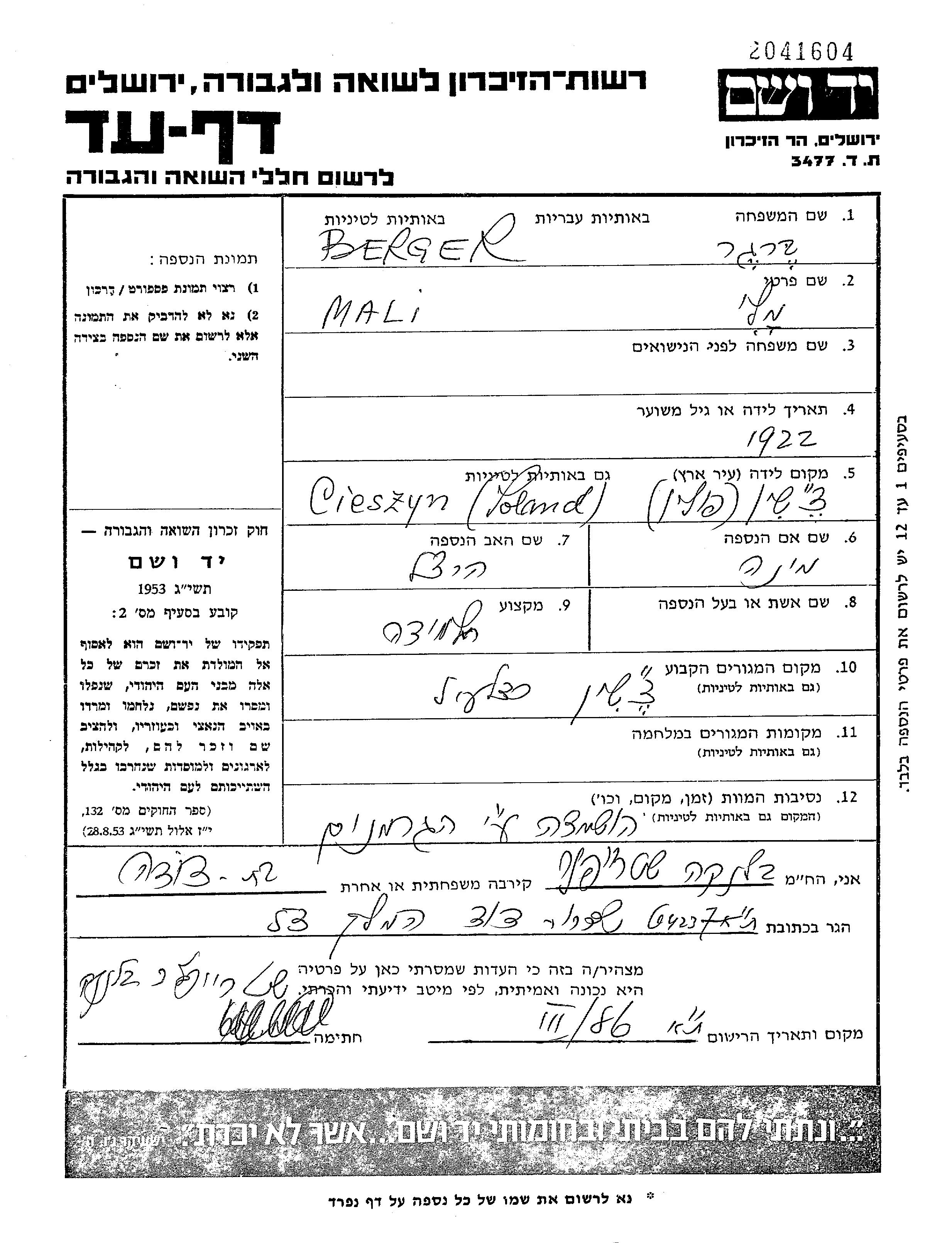 Бергер | Мали | 1922 | Цешин, Польша | Лист свидетельских показаний |