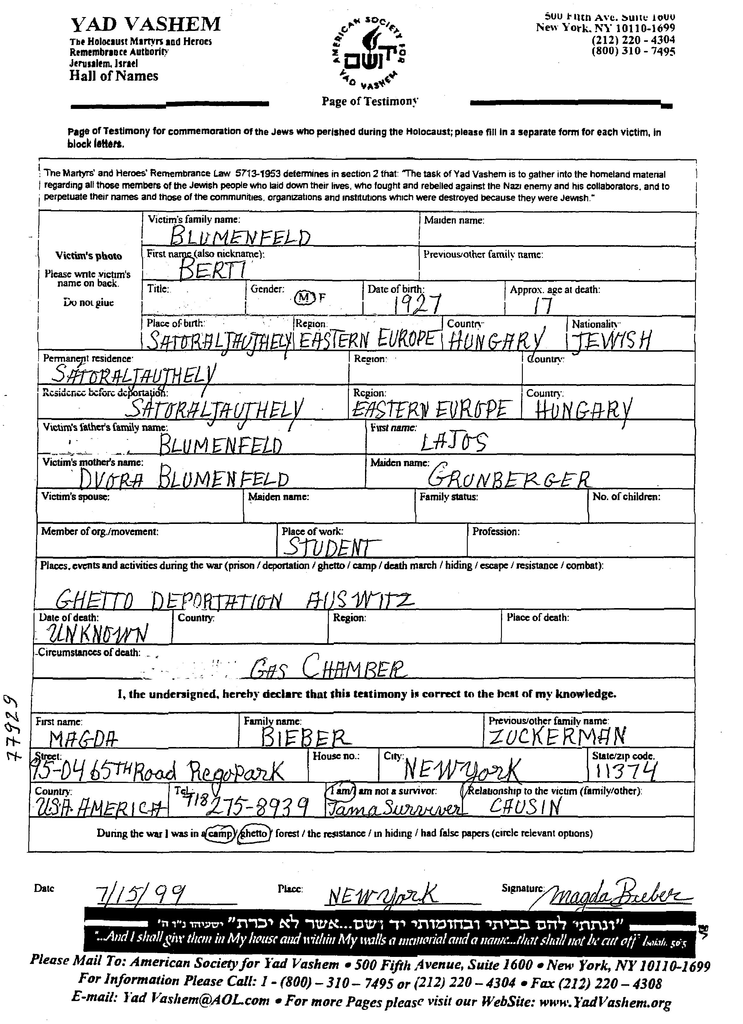 Блюменфельд Берти 1927 Шаторальяуйхей, Венгрия Лист свидетельских показаний