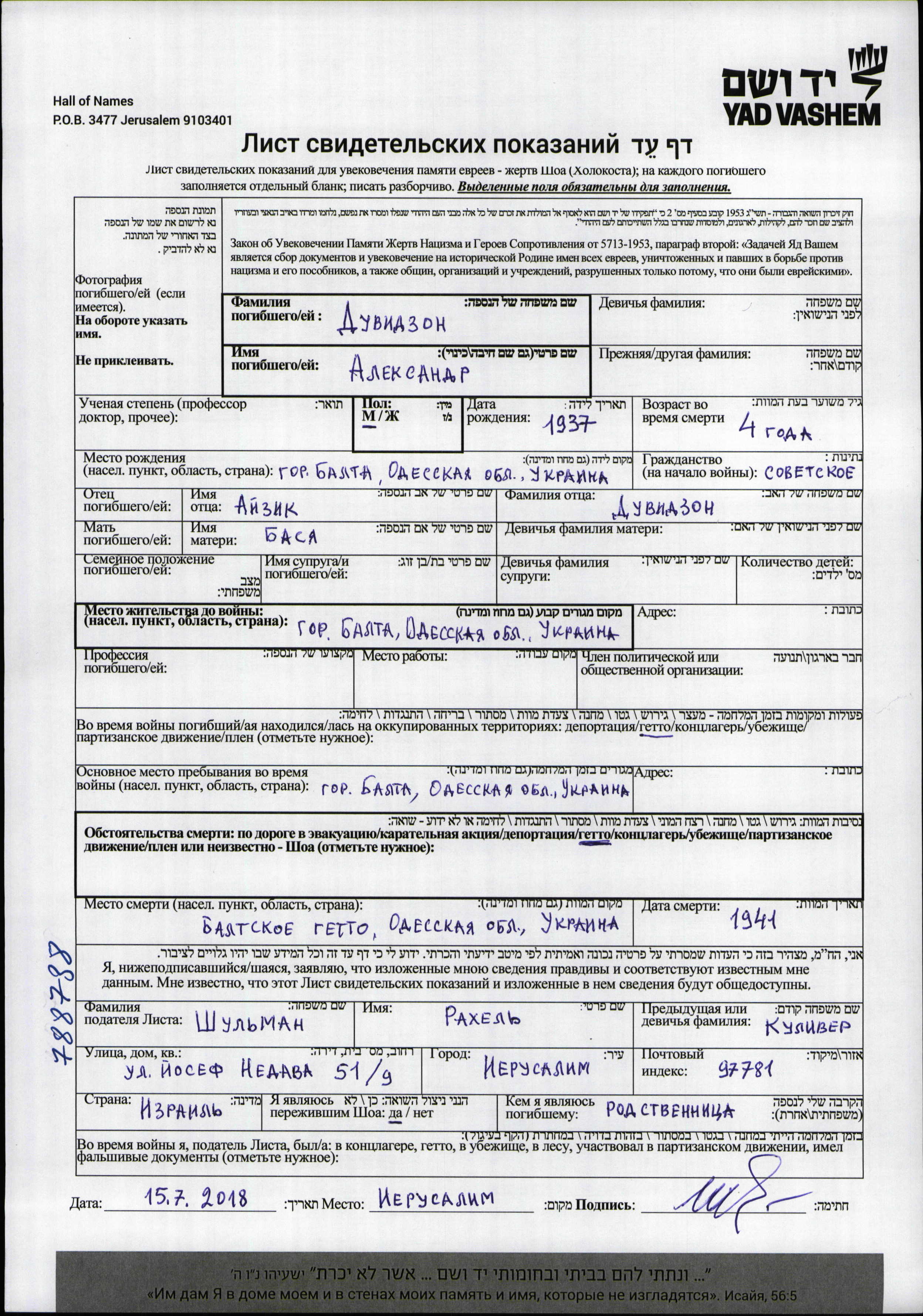 Яд Вашем - Листы свидетельских показаний Мемориального фонда