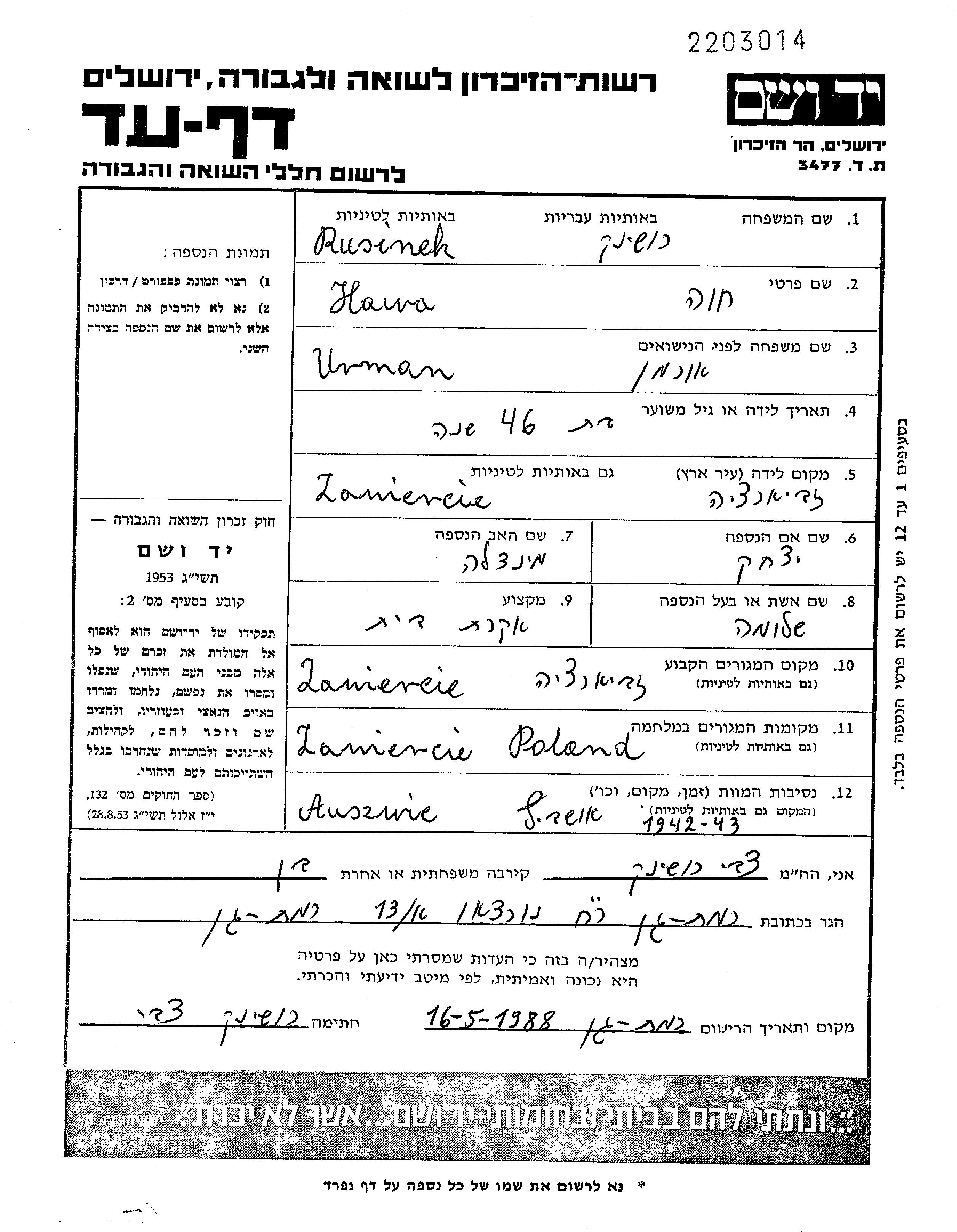 Хава Русинек, девичья фамилия Урман, место рождения: Заверце, Польша. Место жительства до войны: Заверце, Польша.