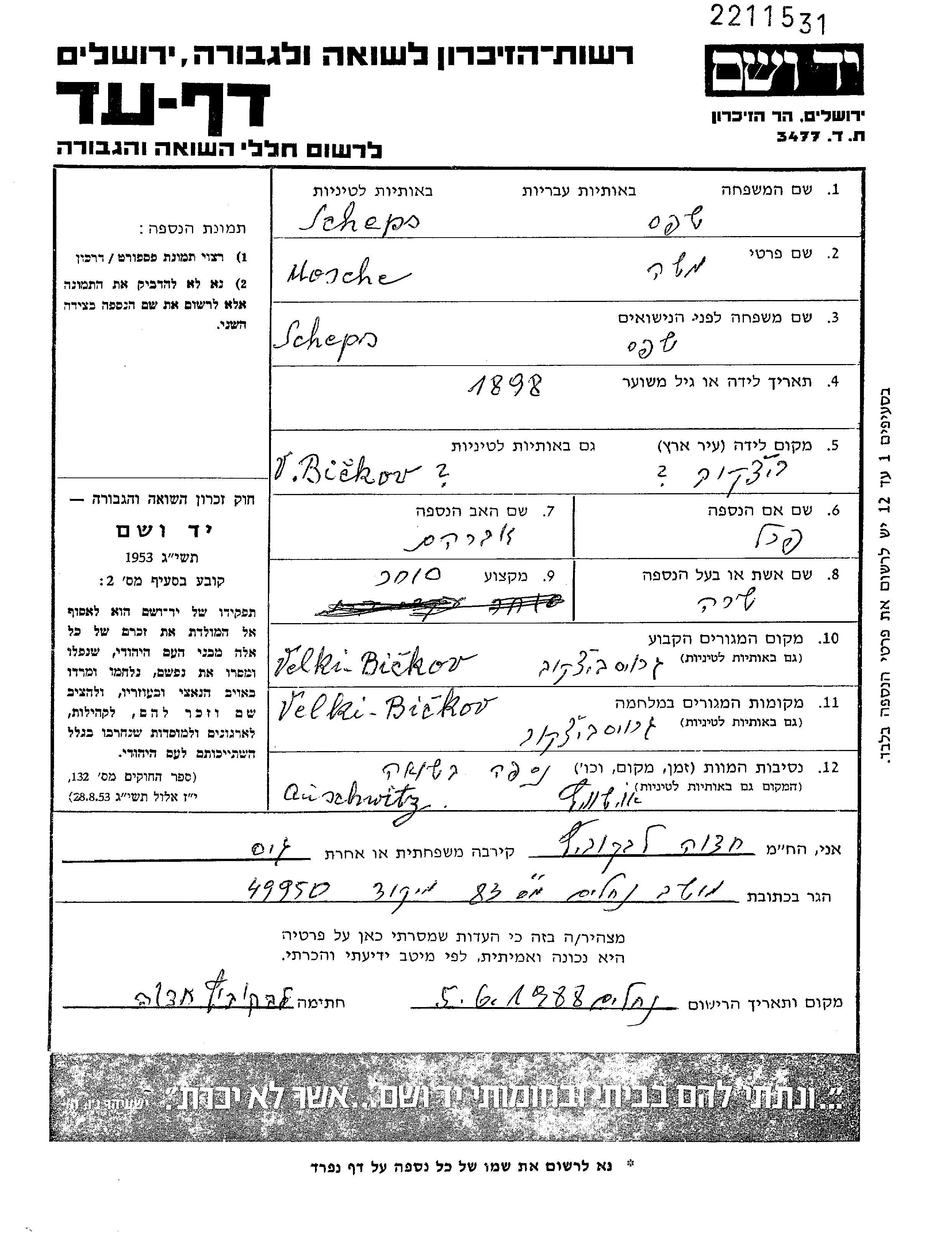 Шапс Мор Моше 1899 Вельки Бочков, Чехословакия Лист свидетельских показаний