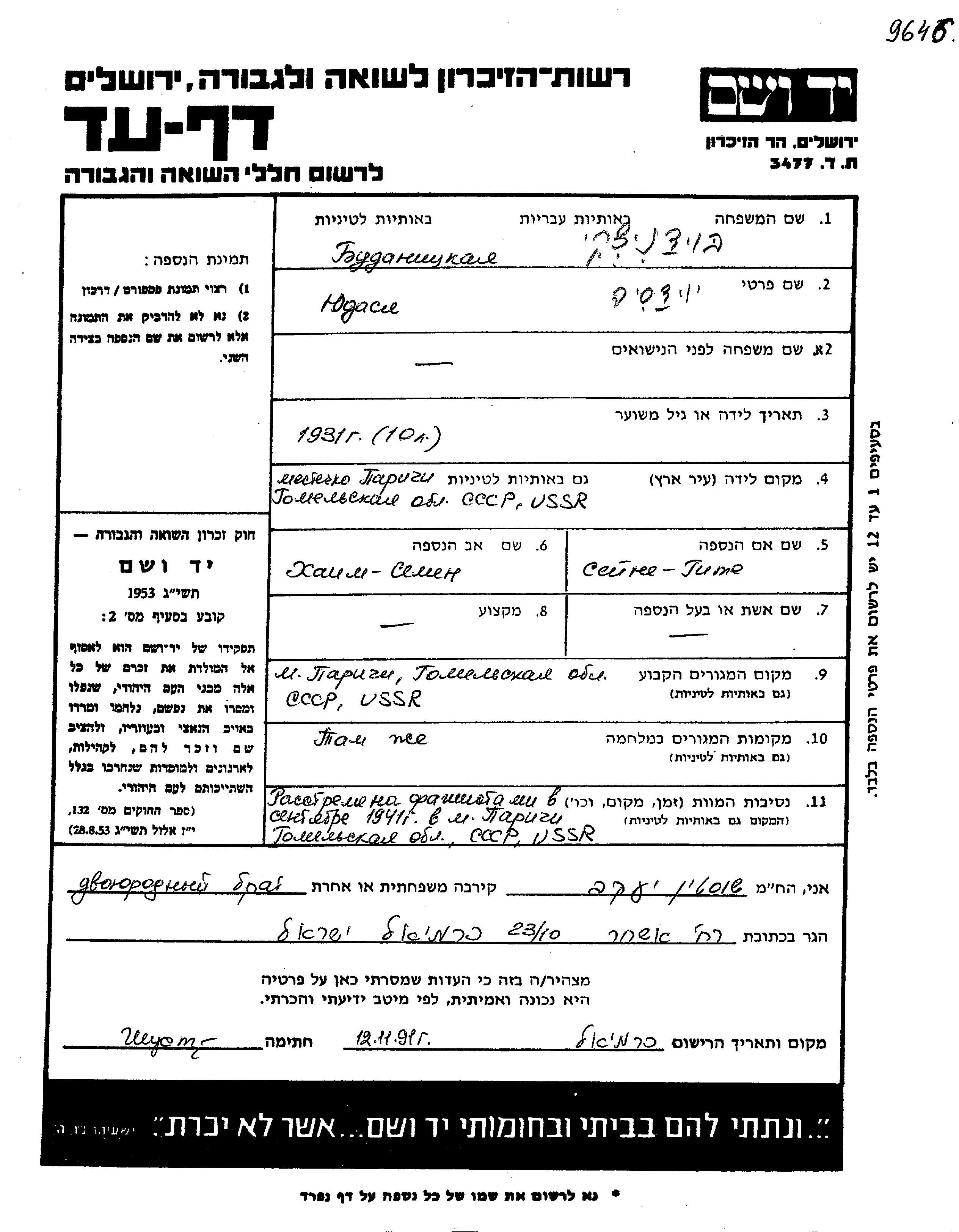 Буданицкий Будницкий Иегудит 1931 Паричи, Белоруссия (СССР) Лист свидетельских показаний