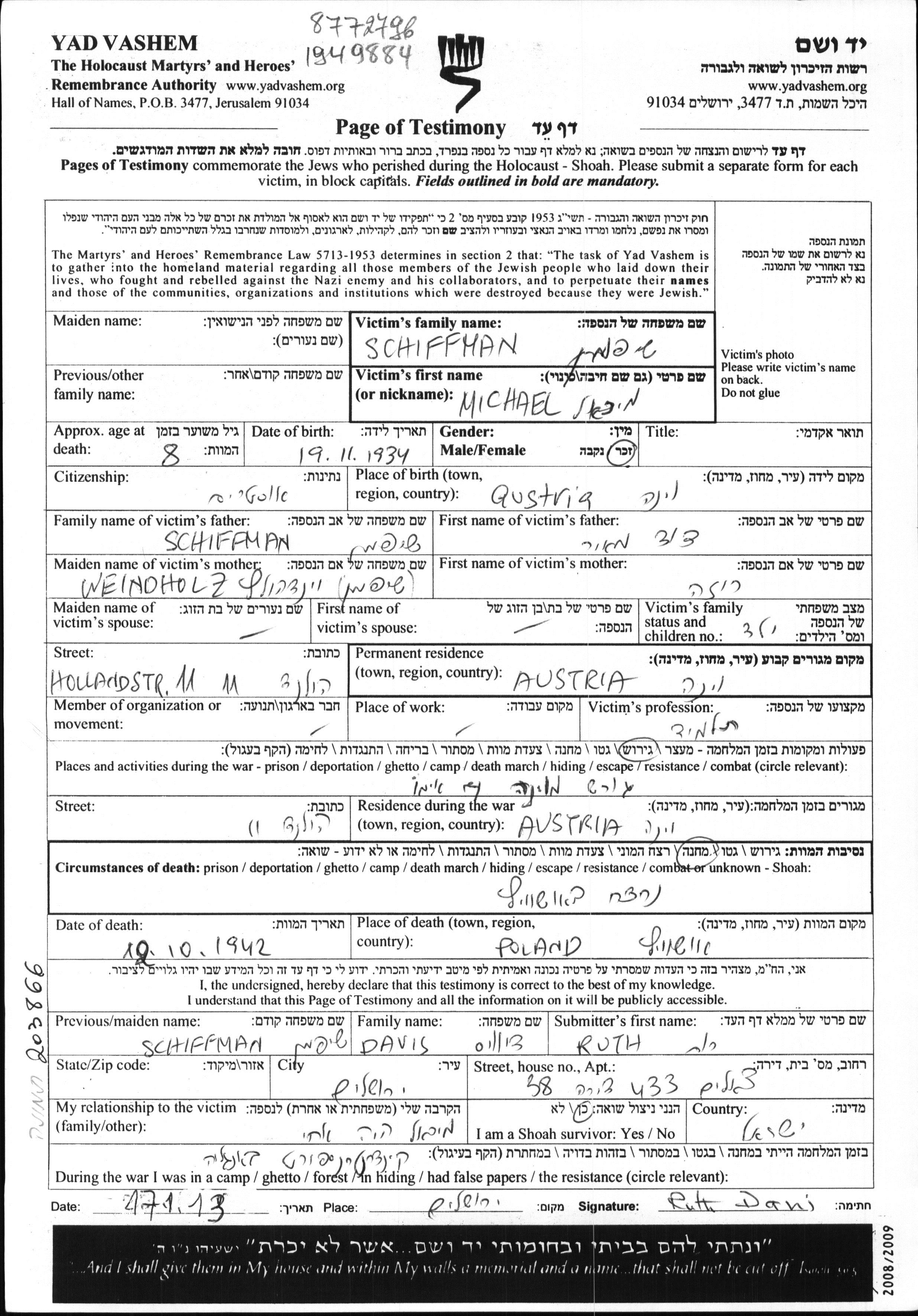 Шиффман Михаэль 1934 Вена, Австрия Лист свидетельских показаний