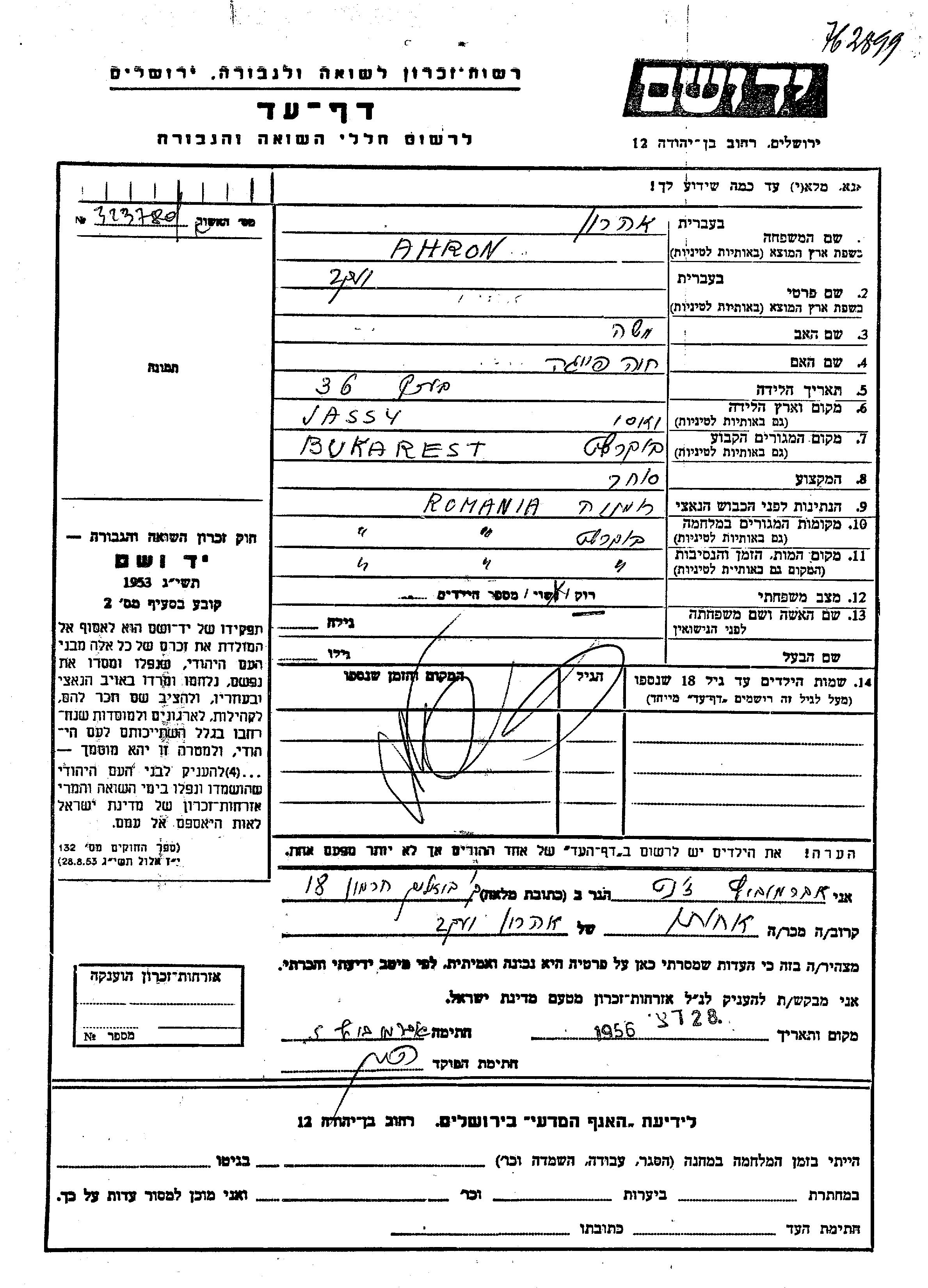 Ахарон Яков Бухарест, Румыния Лист свидетельских показаний