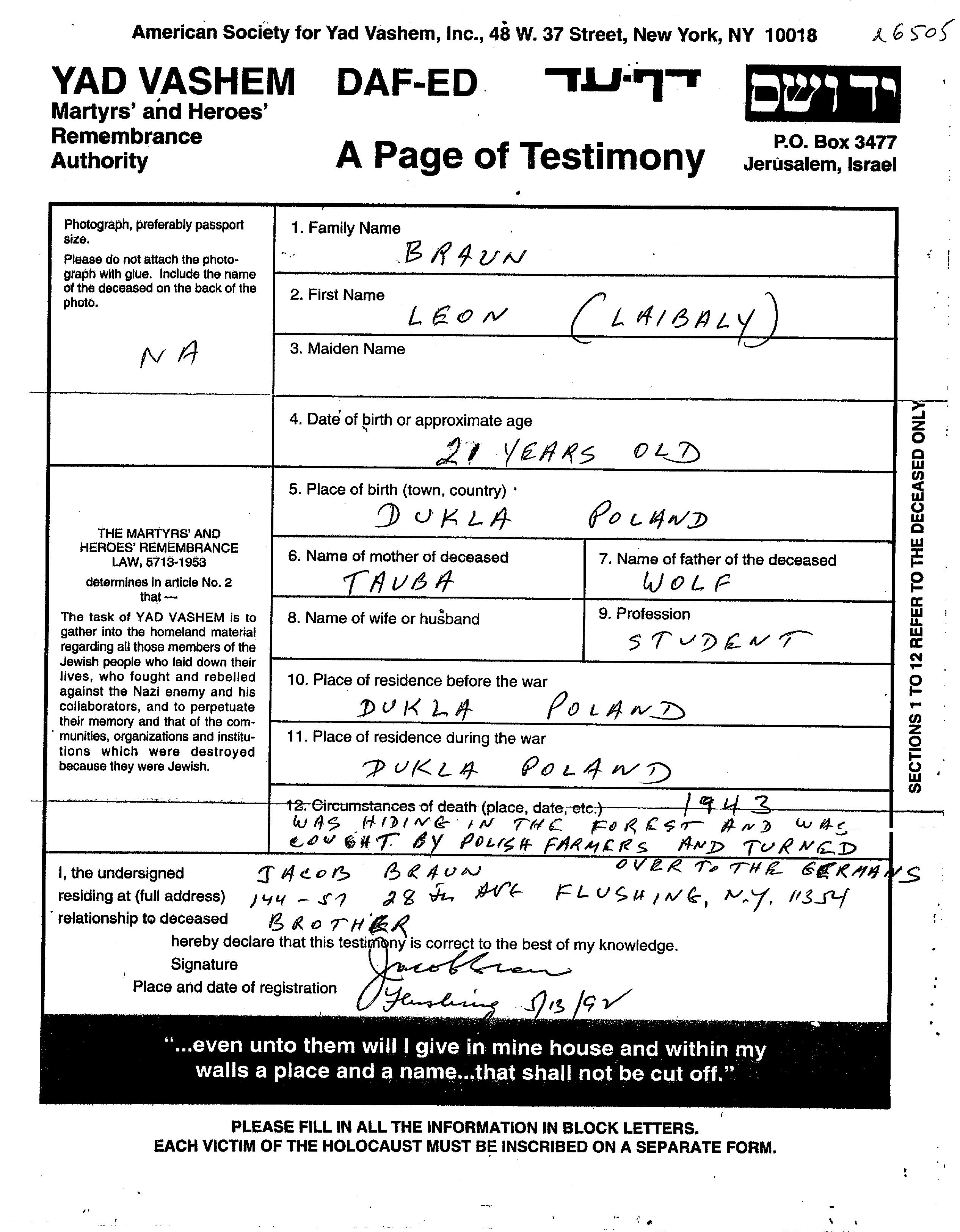 Браун Леон Лайбале 1922 Дукля, Польша Лист свидетельских показаний
