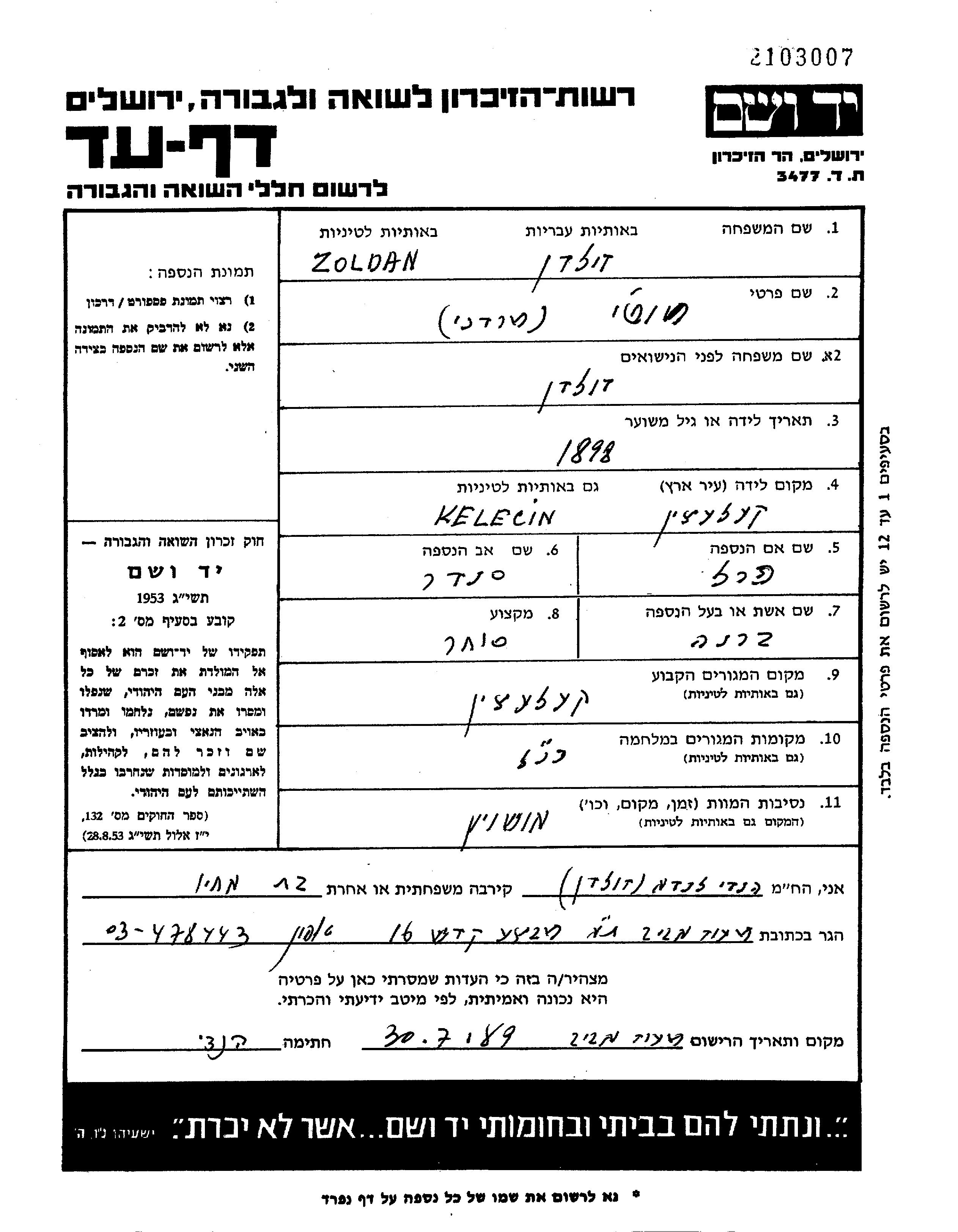 Зольдан Мордехай 1892 Келечин, Чехословакия Лист свидетельских показаний