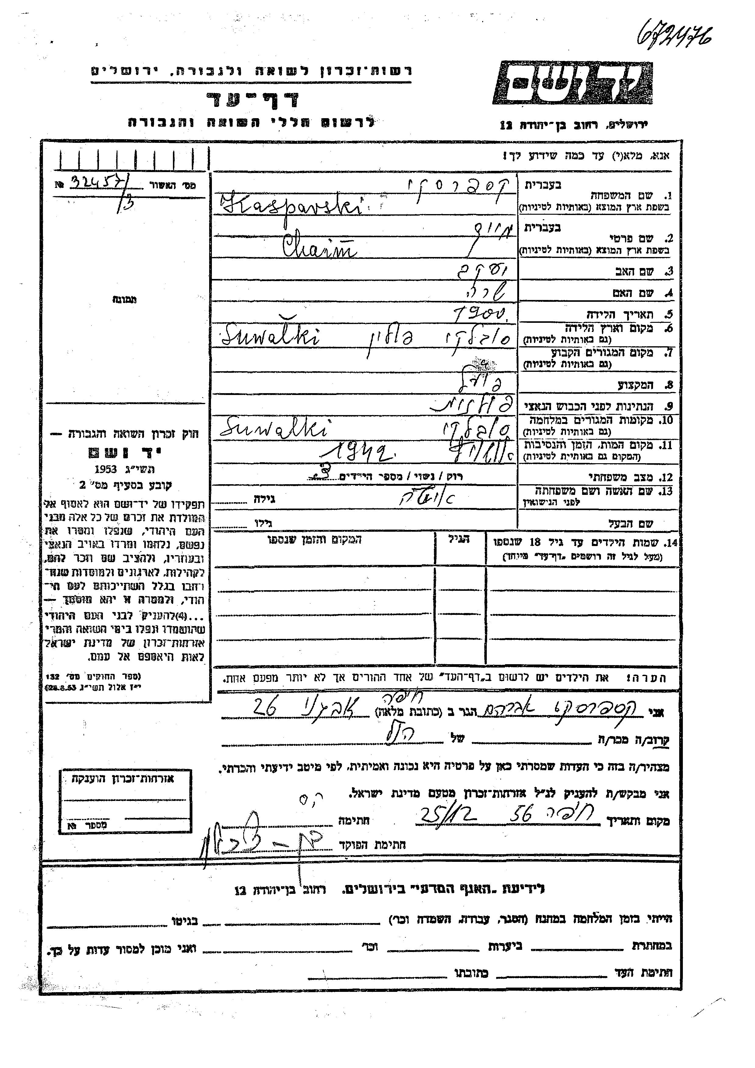 Хаим Шлойме Каспарски. Рабочий / рабочая. Место жительства до войны: Сувалки, Польша.