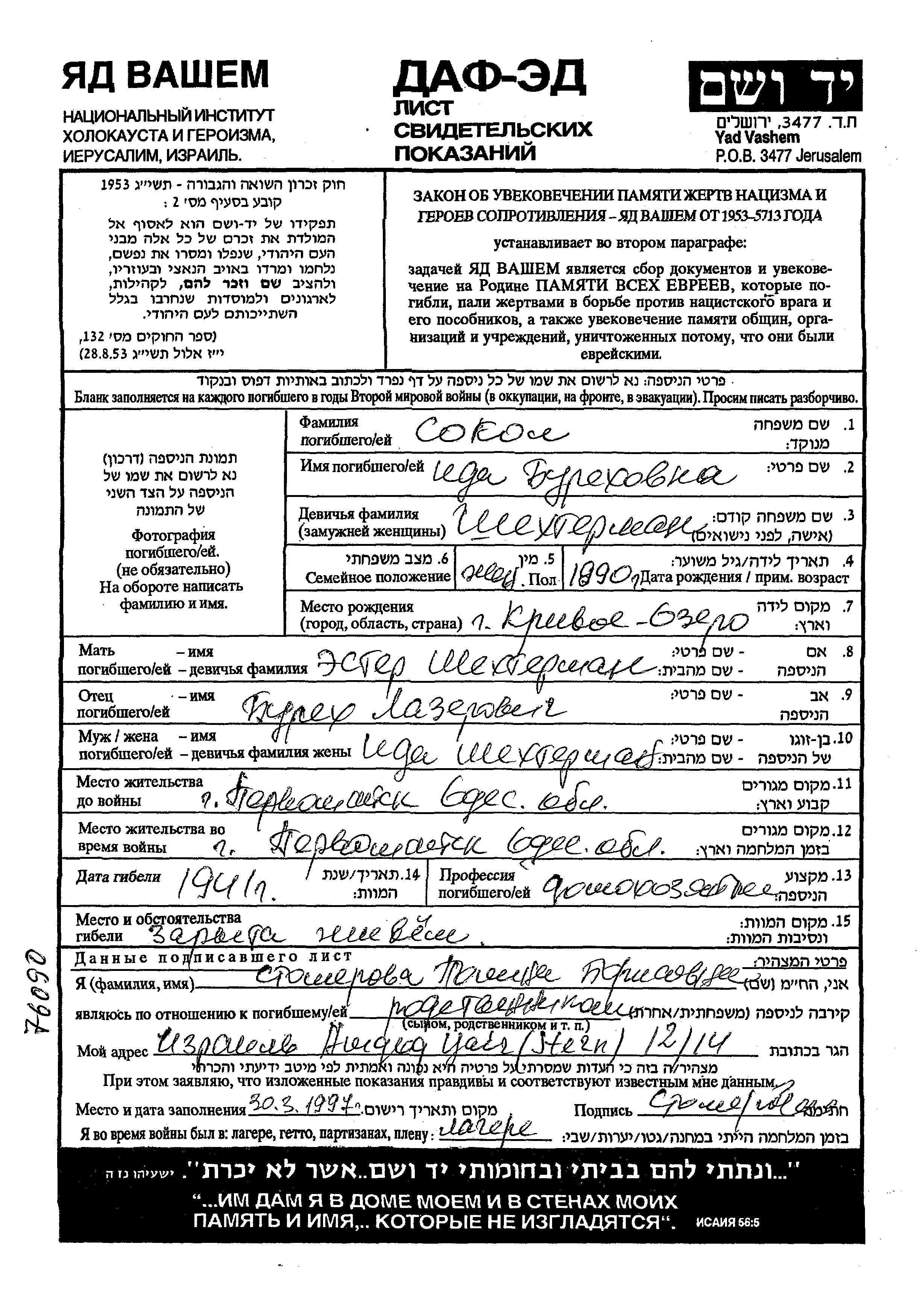 | Сокол | Ида | 1890 | Первомайск, Украина (СССР) | Лист свидетельских показаний |