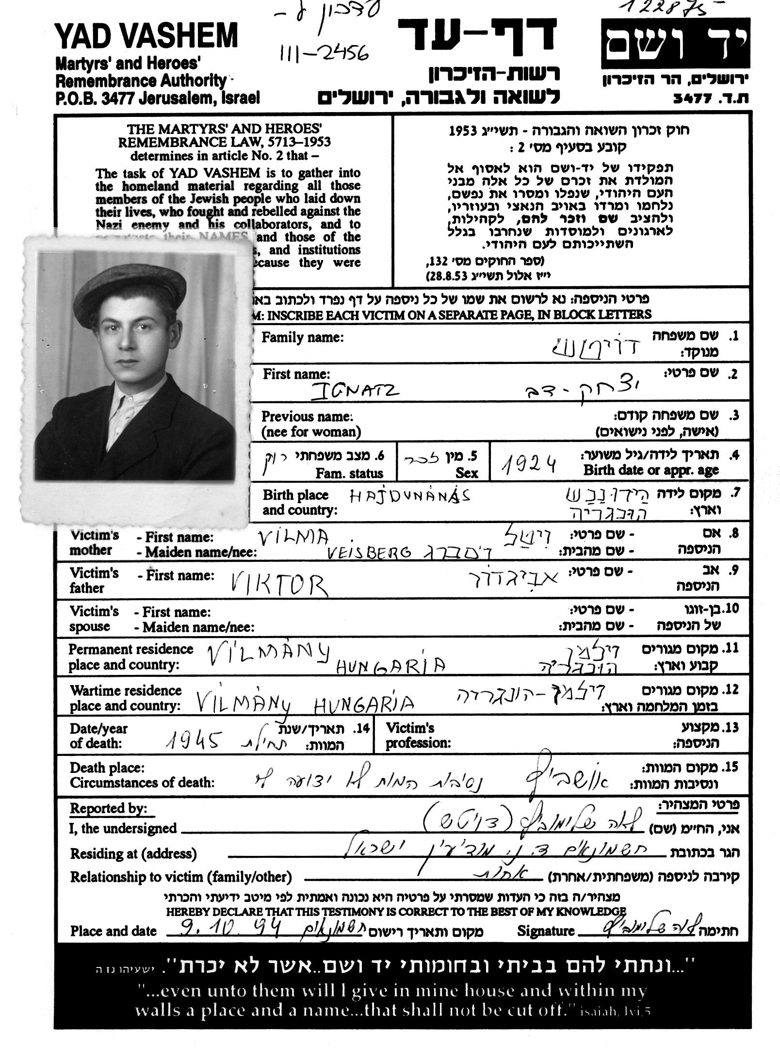 Дейц Ицхак Дов Игнац 1924 Вильмань, Венгрия Лист свидетельских показаний