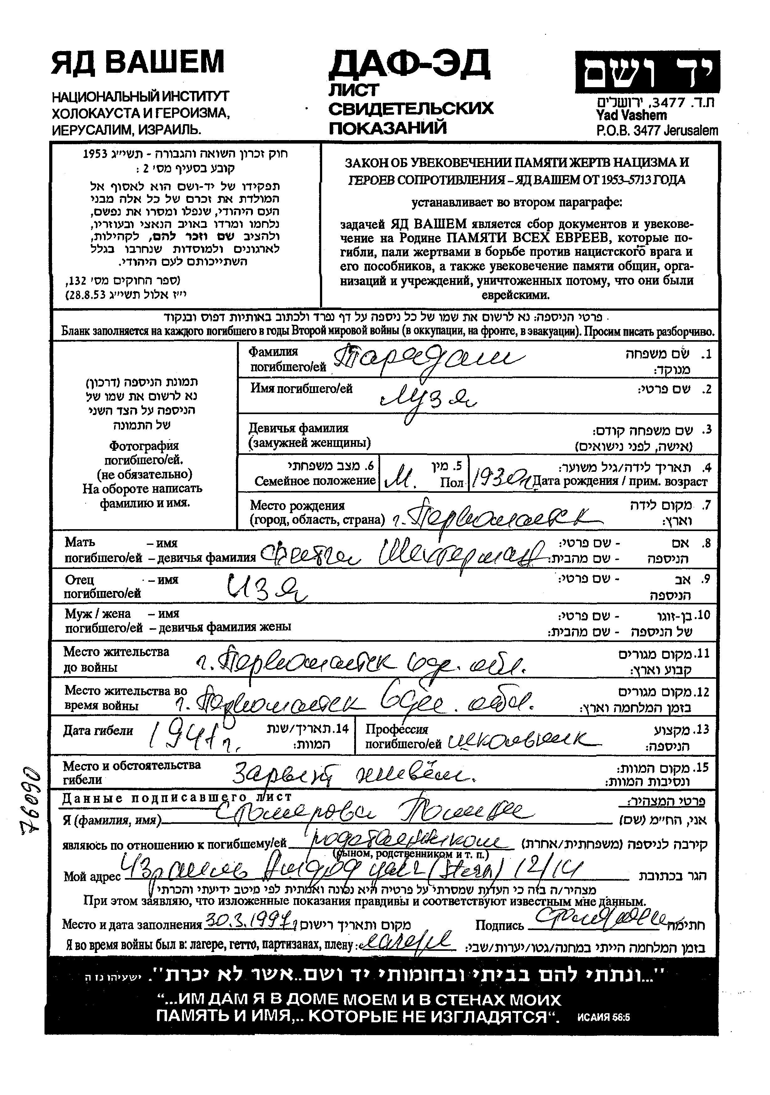 Тарадаш Шехтерман | Лузя | 1930 | Первомайск, Украина (СССР) | Лист свидетельских показаний |