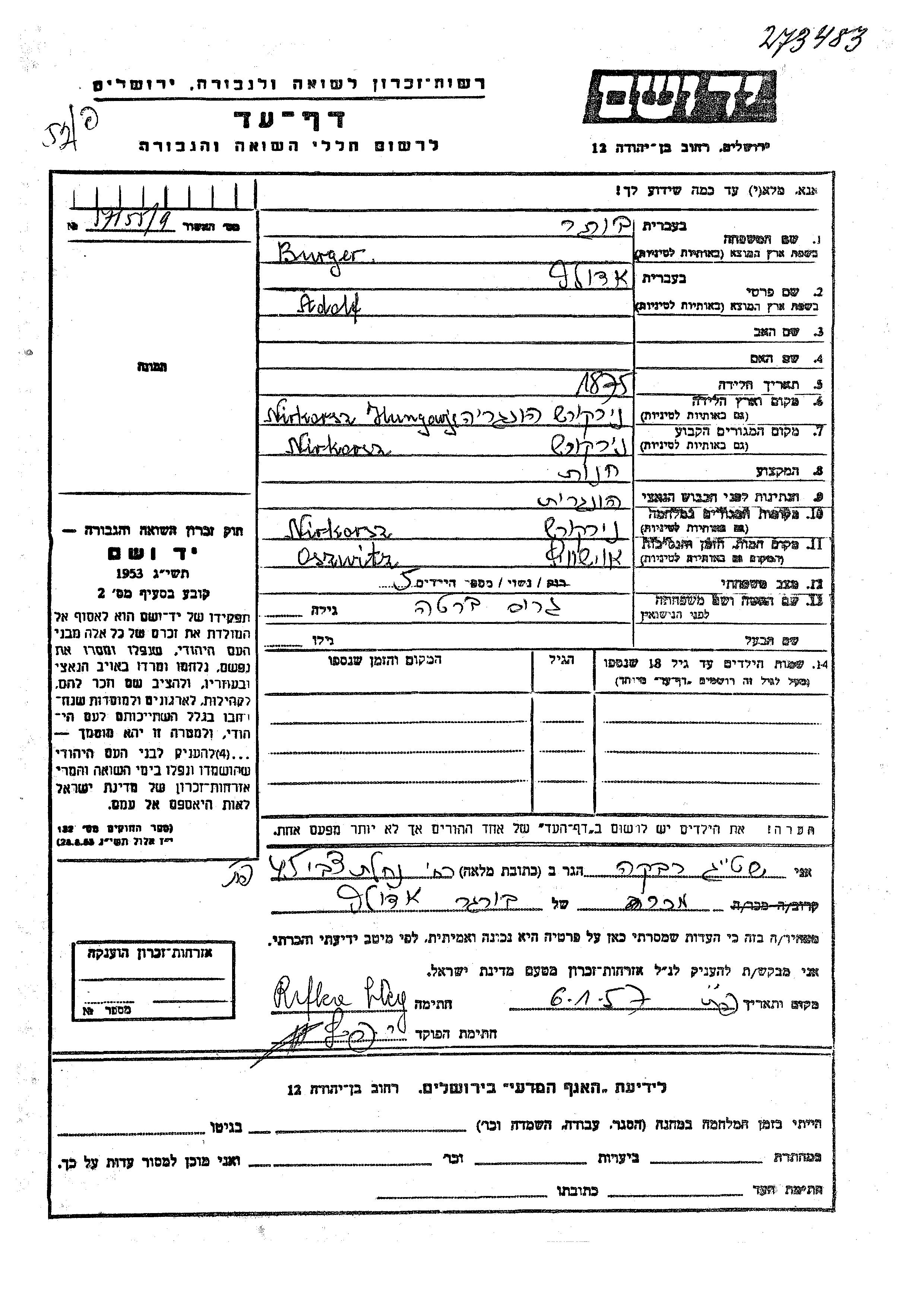 Бургер Адольф 1875 Ньиркарас, Венгрия Лист свидетельских показаний