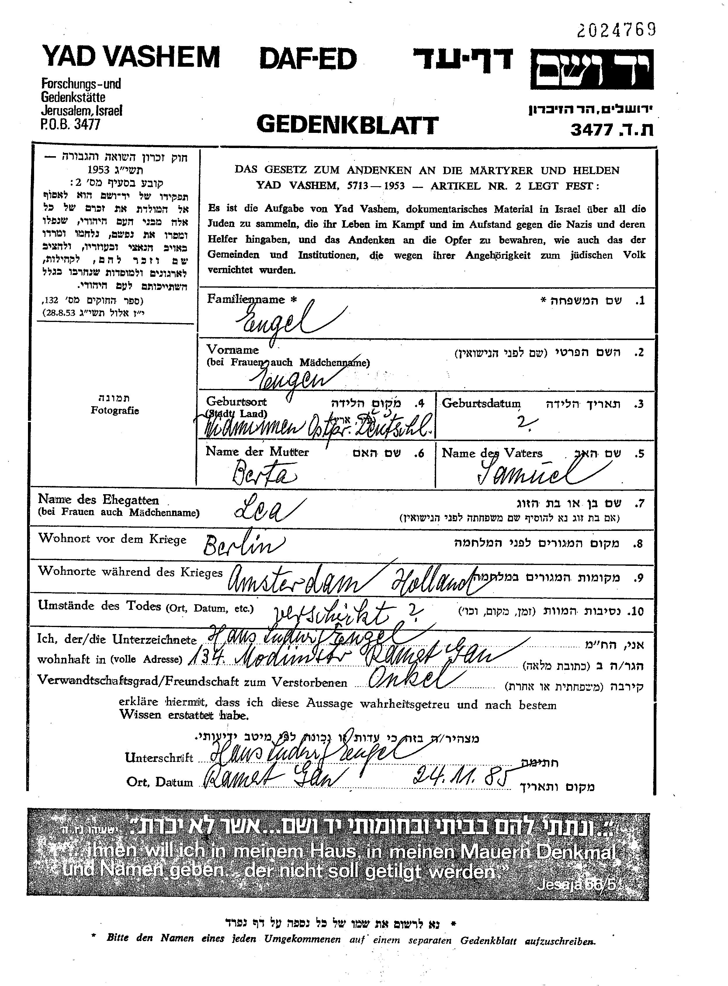 Эуген Энгель, место рождения: Видминнен, Германия. Место жительства до войны: Амстердам, Нидерланды.
