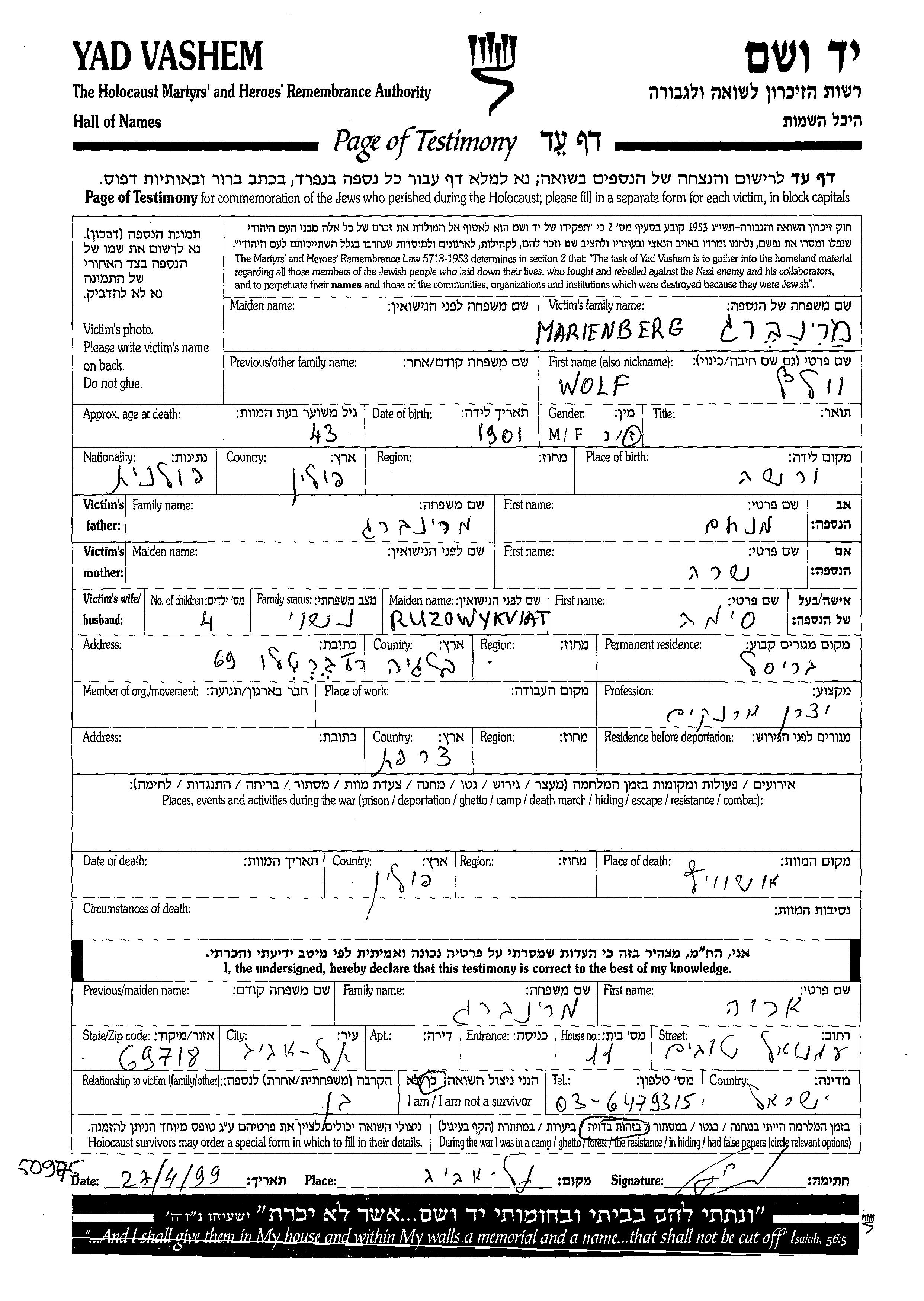 Маринберг Зеев Брюссель, Бельгия Лист свидетельских показаний