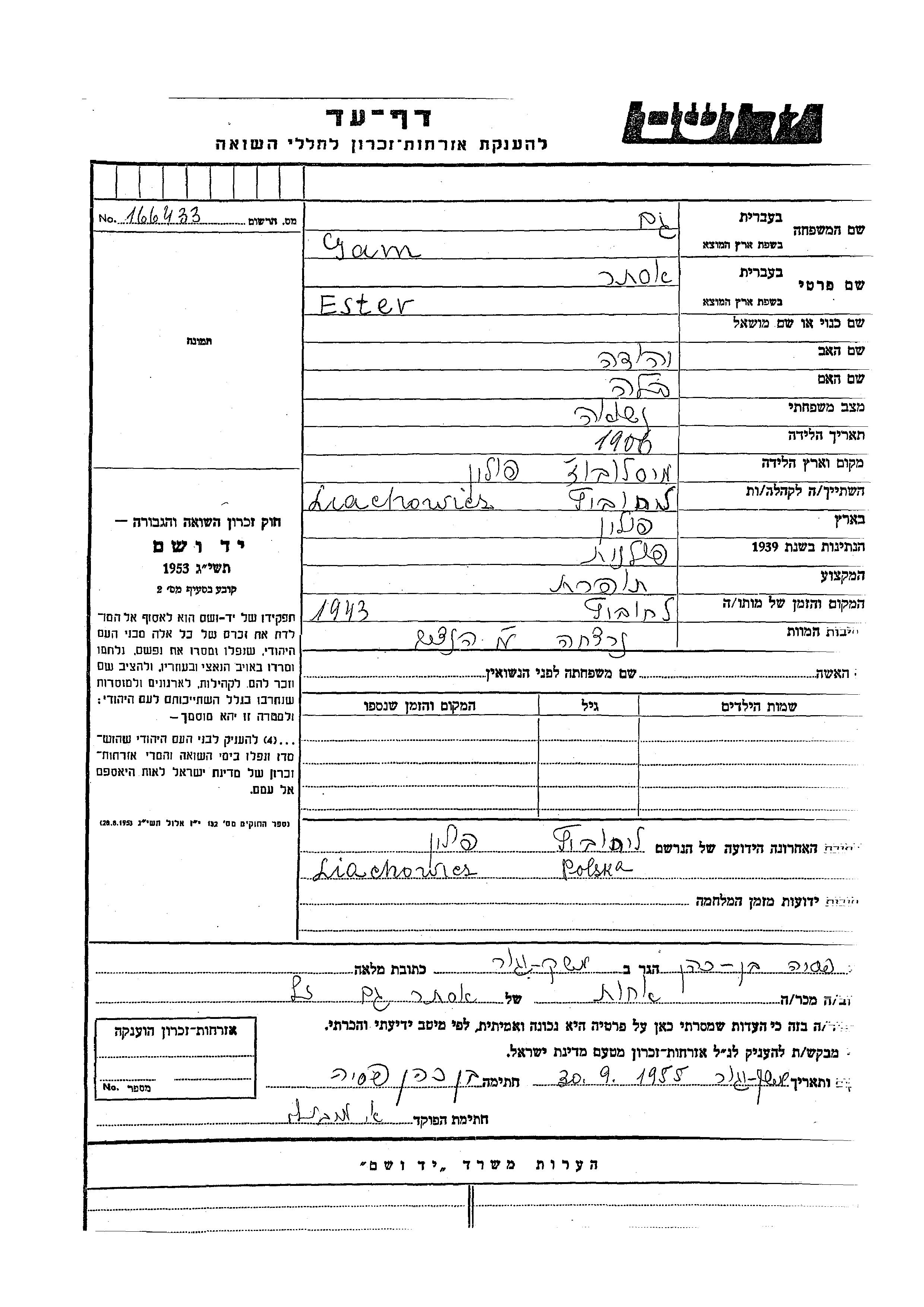 Гам Эстер 1906 Ляховичи, Польша Лист свидетельских показаний