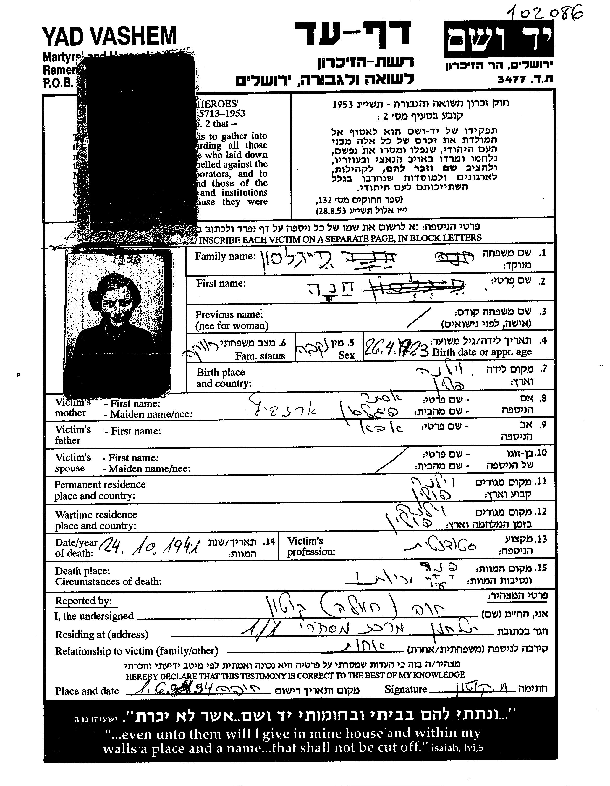 | Фейгельсон | Хана | 1923 | Вильно, Польша | Лист свидетельских показаний |
