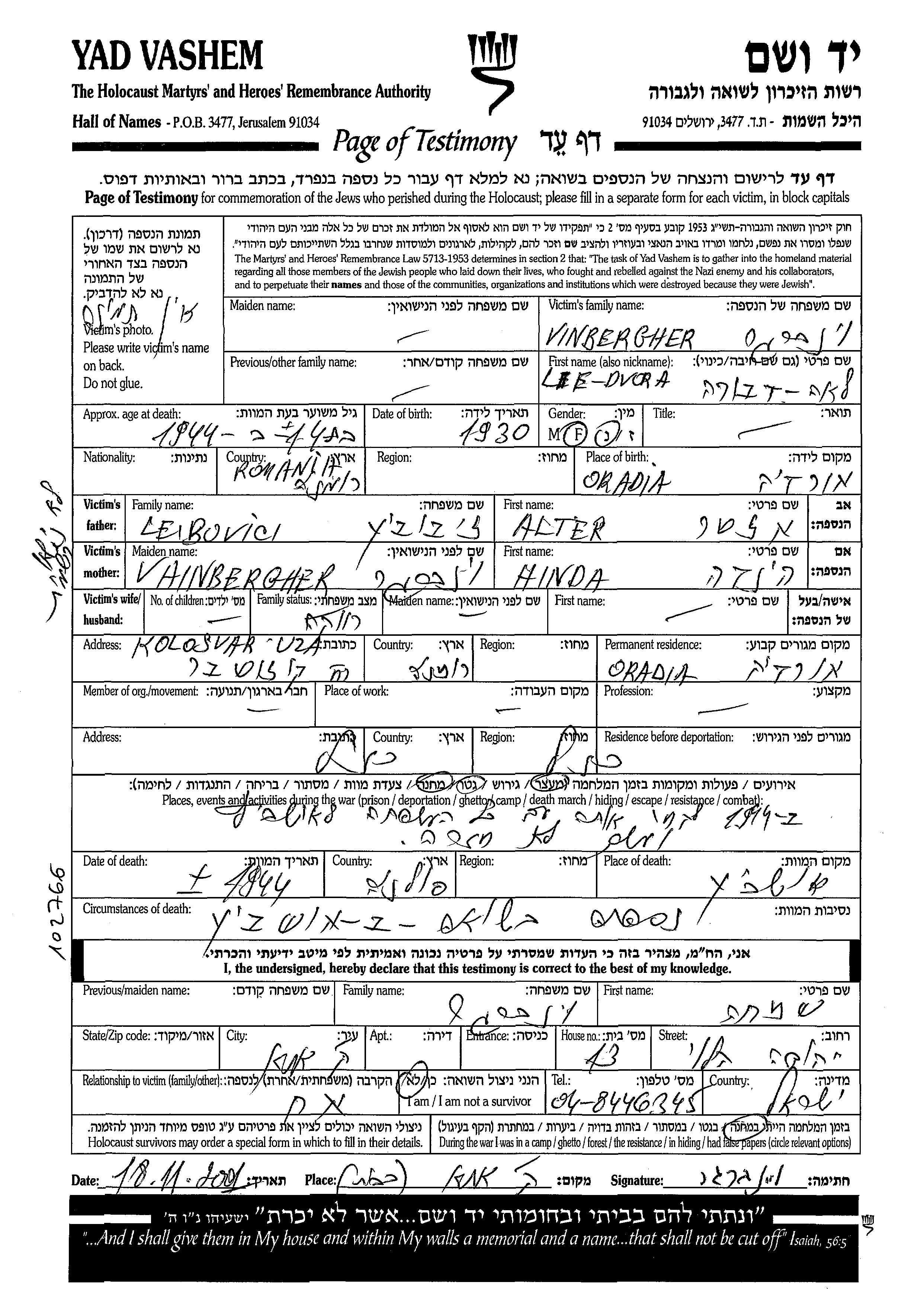 Винбергер | Лее Двора | 1930 | Орадя, Румыния | Лист свидетельских показаний |