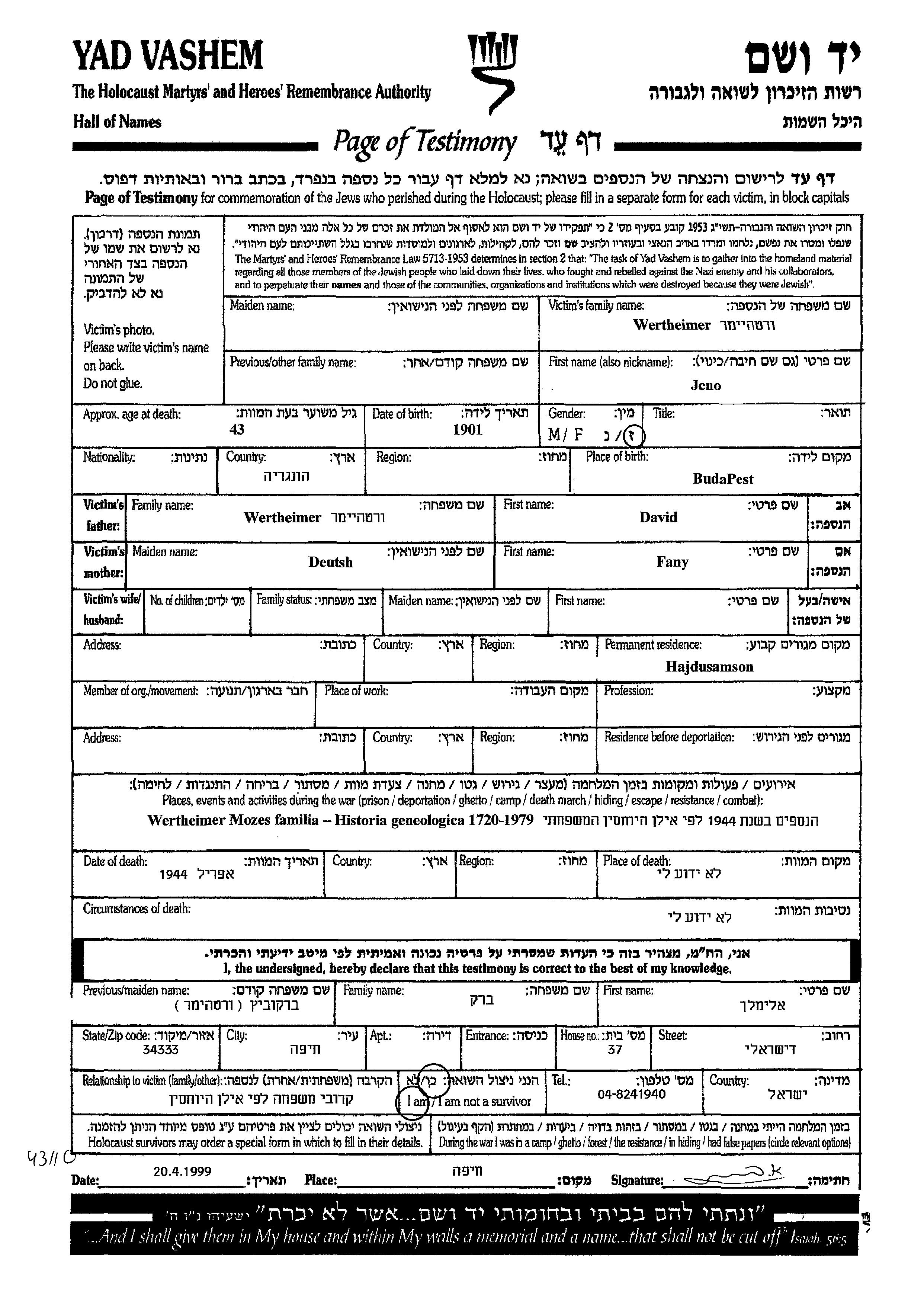 Вертхаймер | Ено | 1901 | Хайдушамшон, Венгрия | Лист свидетельских показаний |