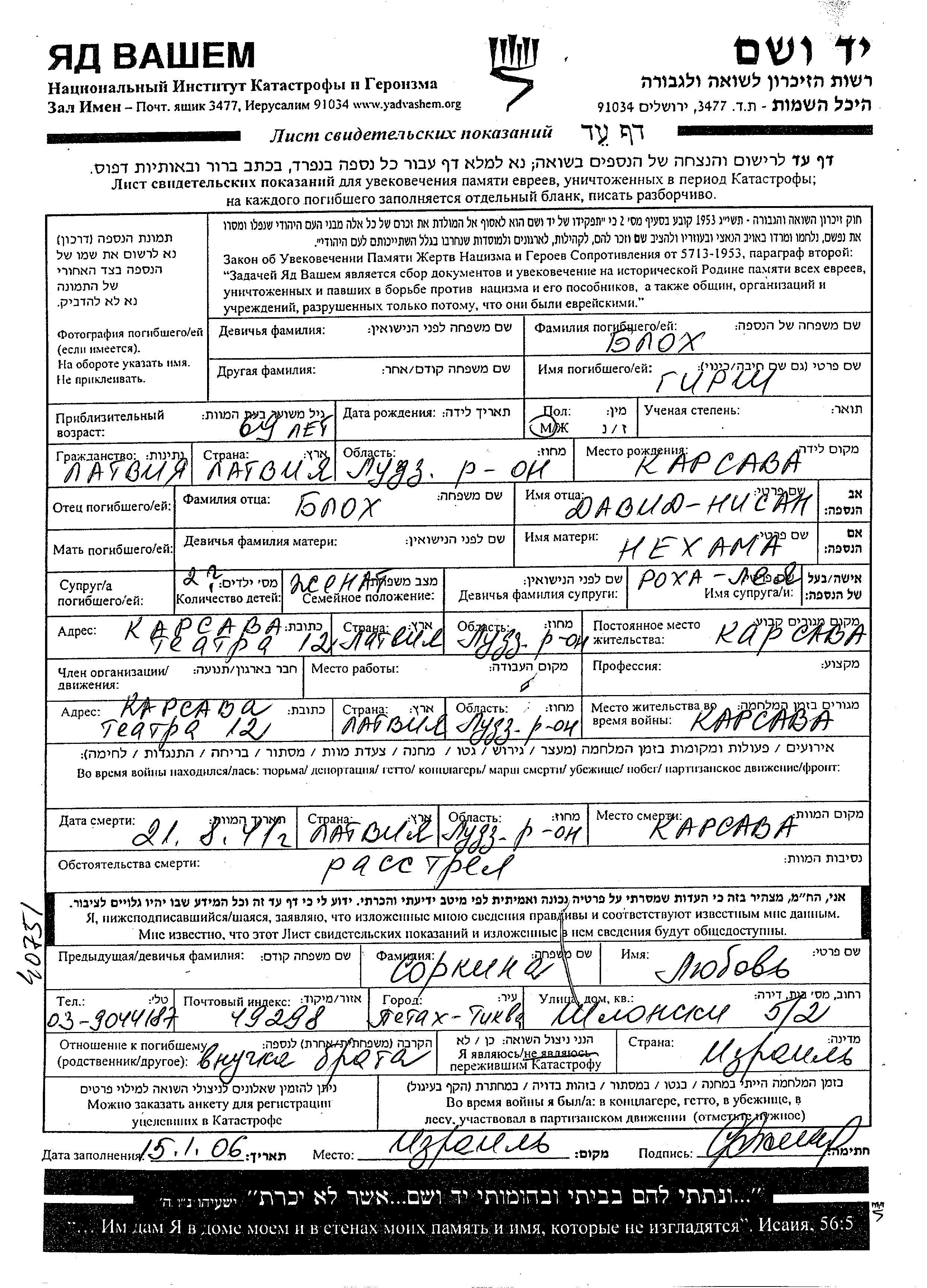 Яд Вашем - Листы свидетельских показаний Мемориального фонда