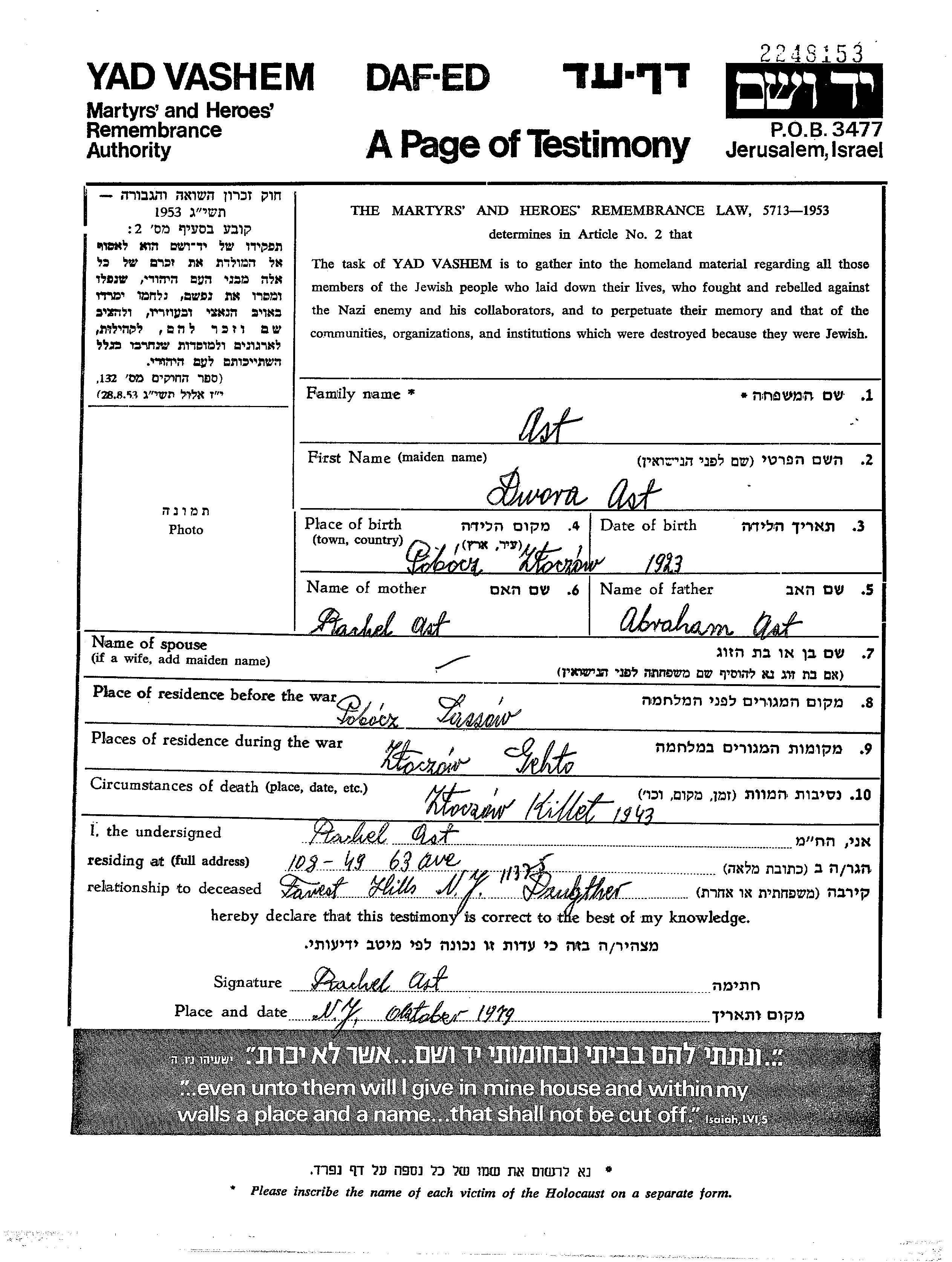 Двора Аст, место рождения: Побоч, Польша. Место жительства до войны: Побоч, Польша.