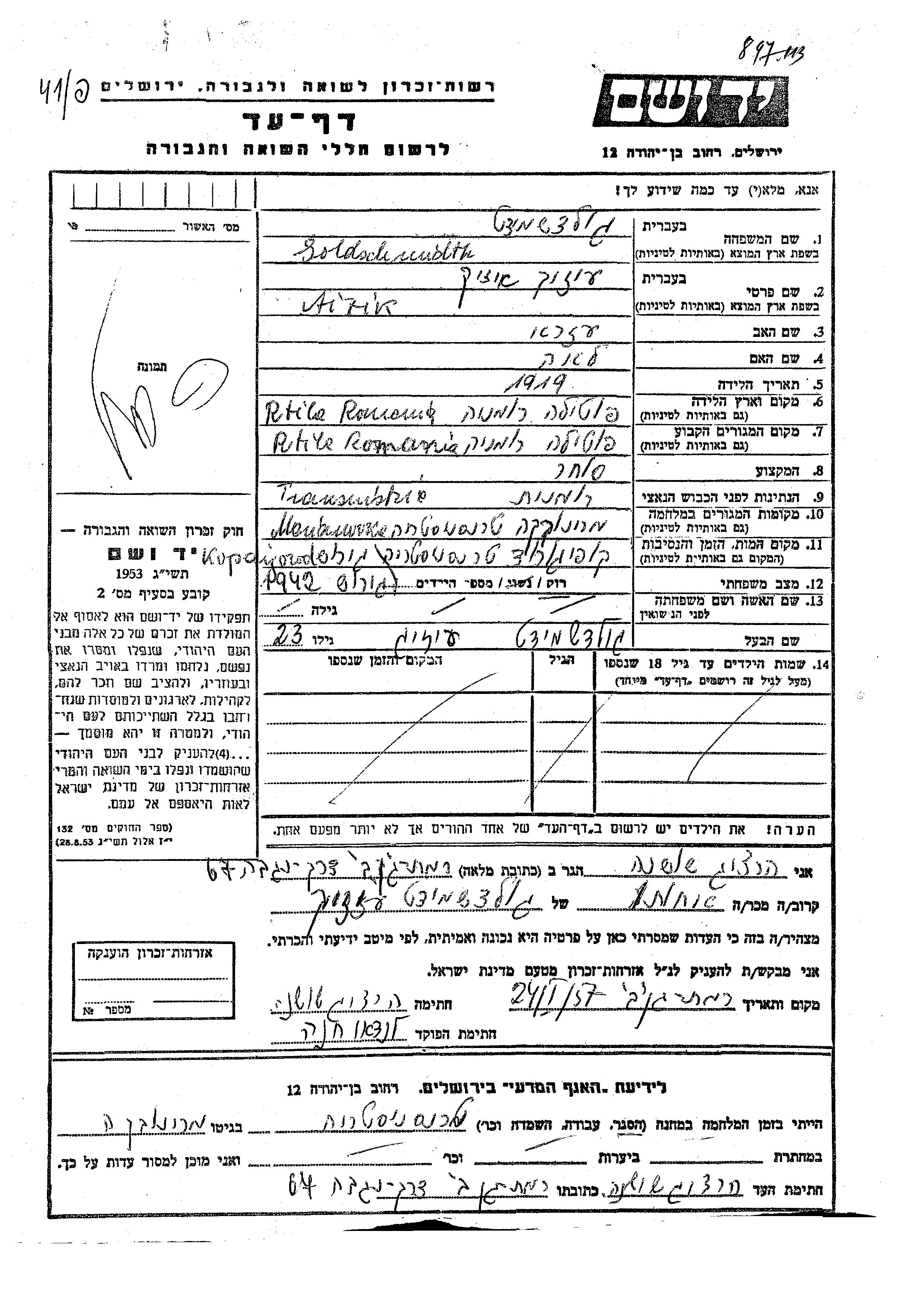 Гольдшмит Айзик 1919 Потила, Румыния Лист свидетельских показаний