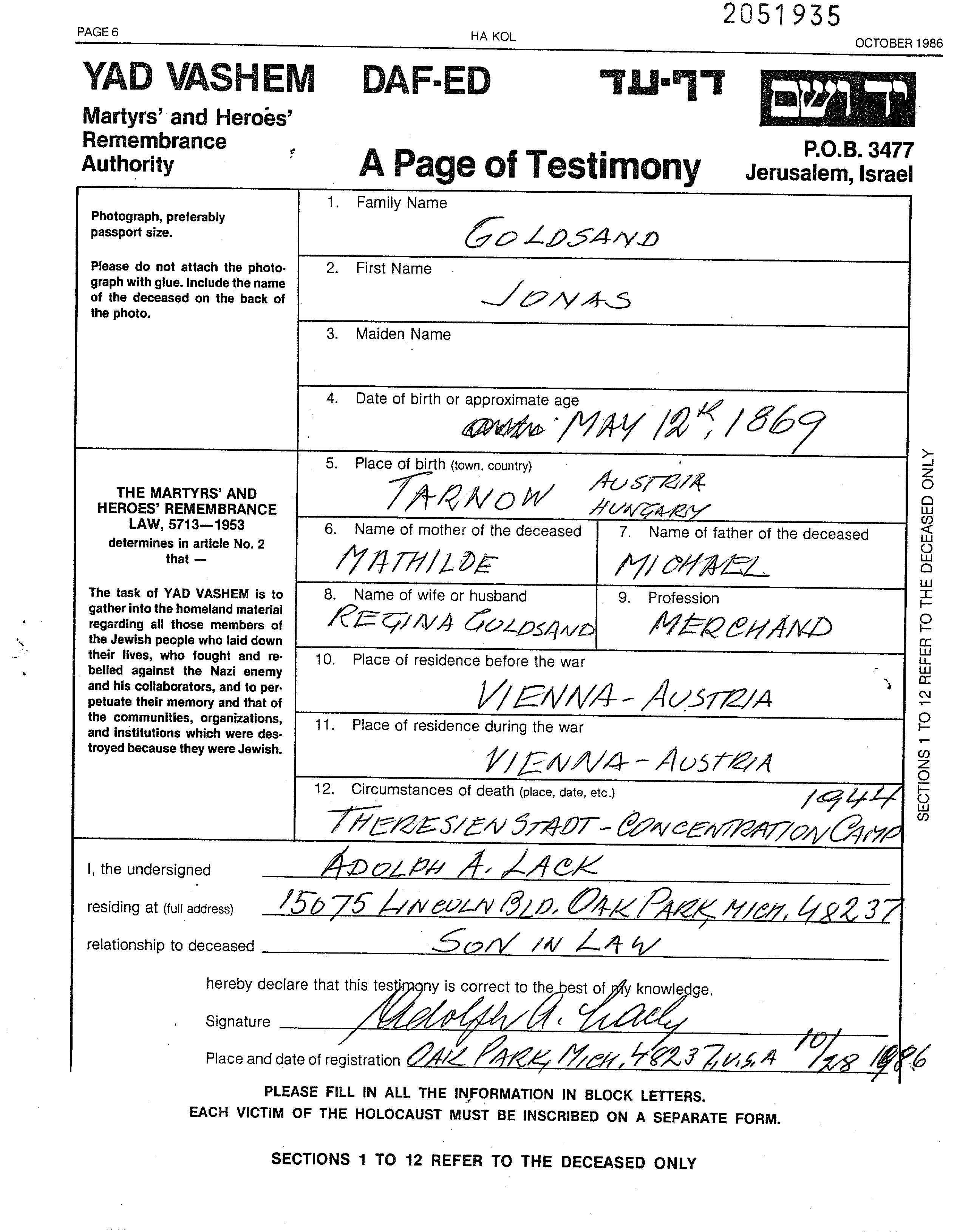 Иона Маркус Гольдзанд, место рождения: Тарнув, Польша. Место жительства до войны: Вена, Австрия.