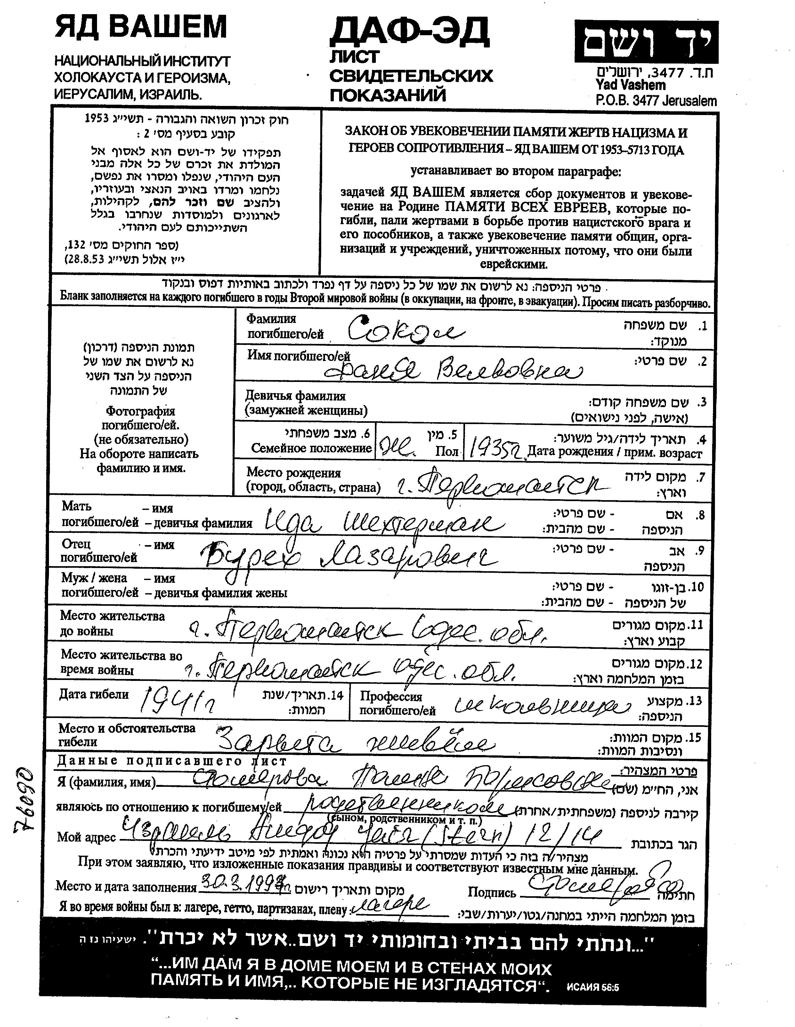 Сокол Фаня 1935 Первомайск, Украина (СССР) Лист свидетельских показаний