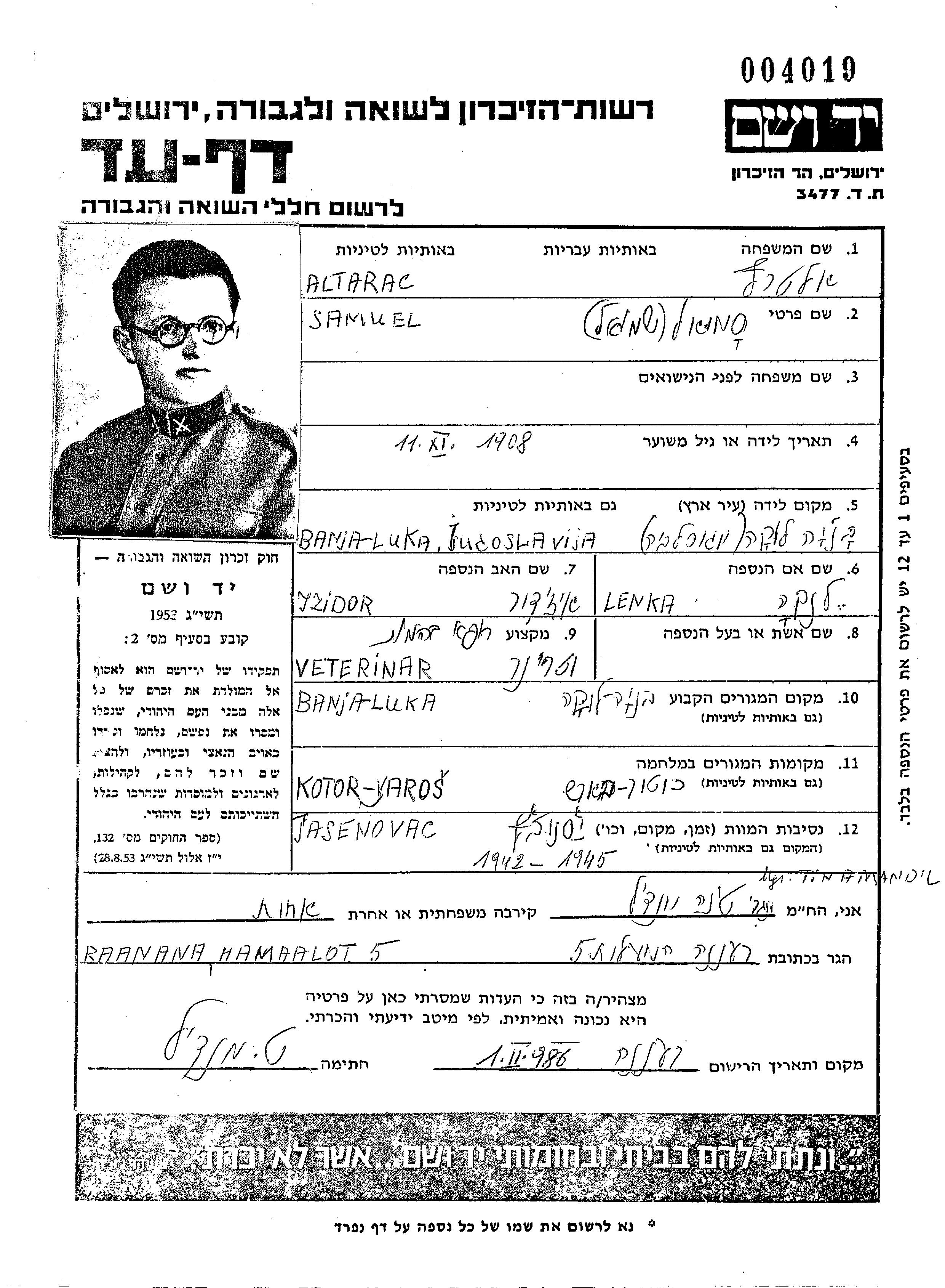 | Альтарац | Шмуэль | 1908 | Банья Лука, Югославия | Лист свидетельских показаний |
