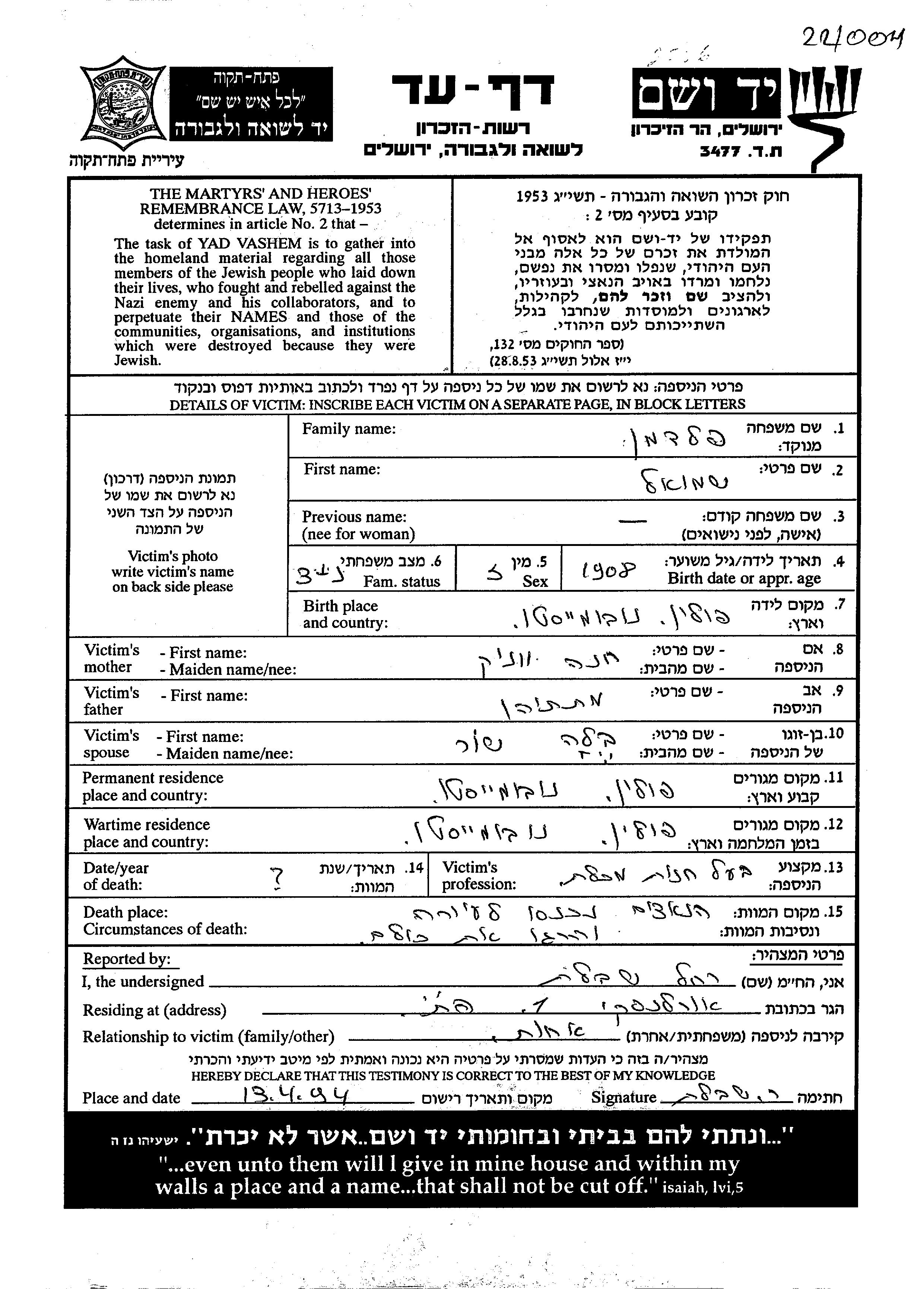 Фельдман | Шмуэль | 1908 | Нове-Място, Польша | Лист свидетельских показаний |