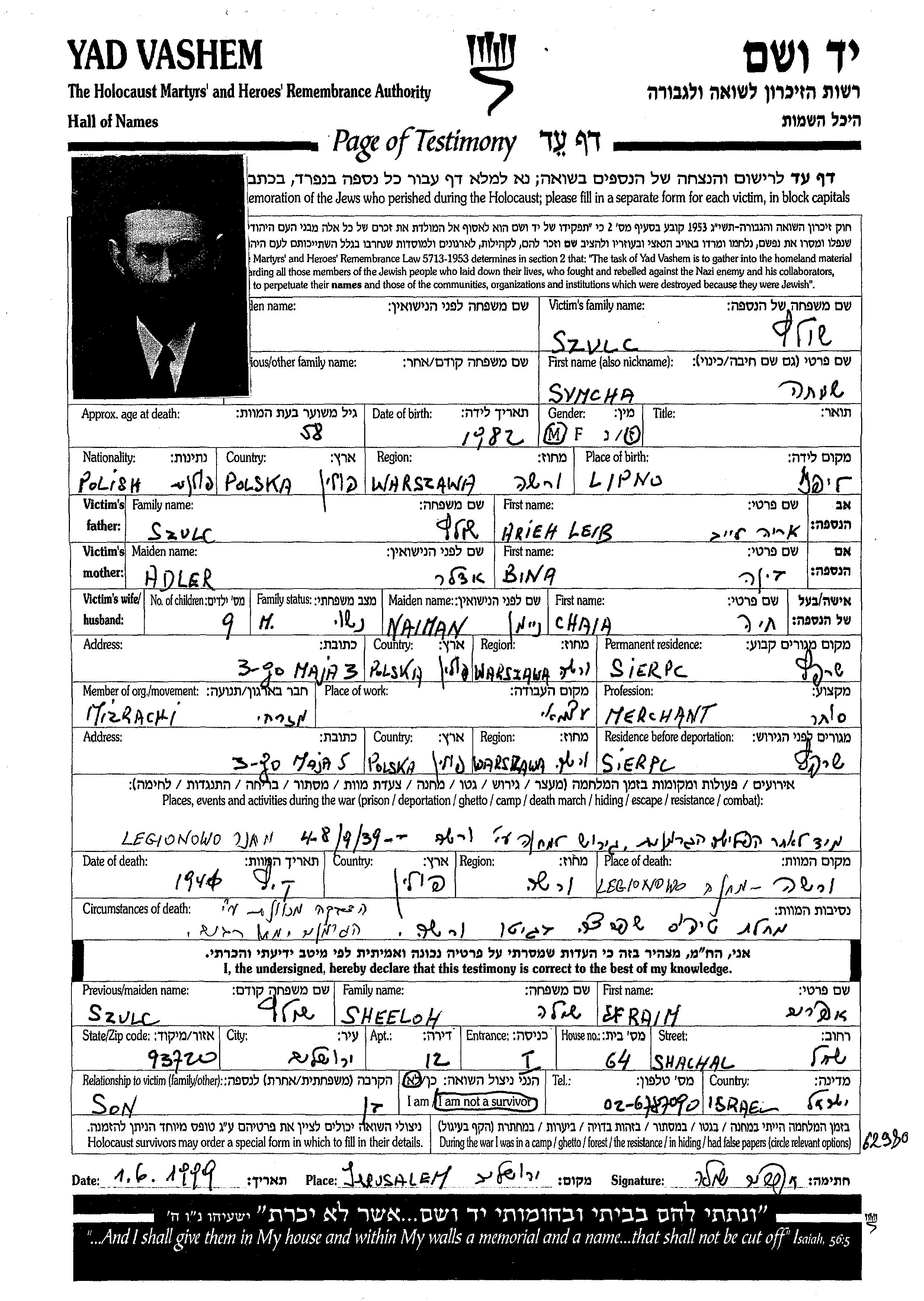 Симха Шульц, место рождения: Липно, Польша. Место жительства до войны: Серпц, Польша.