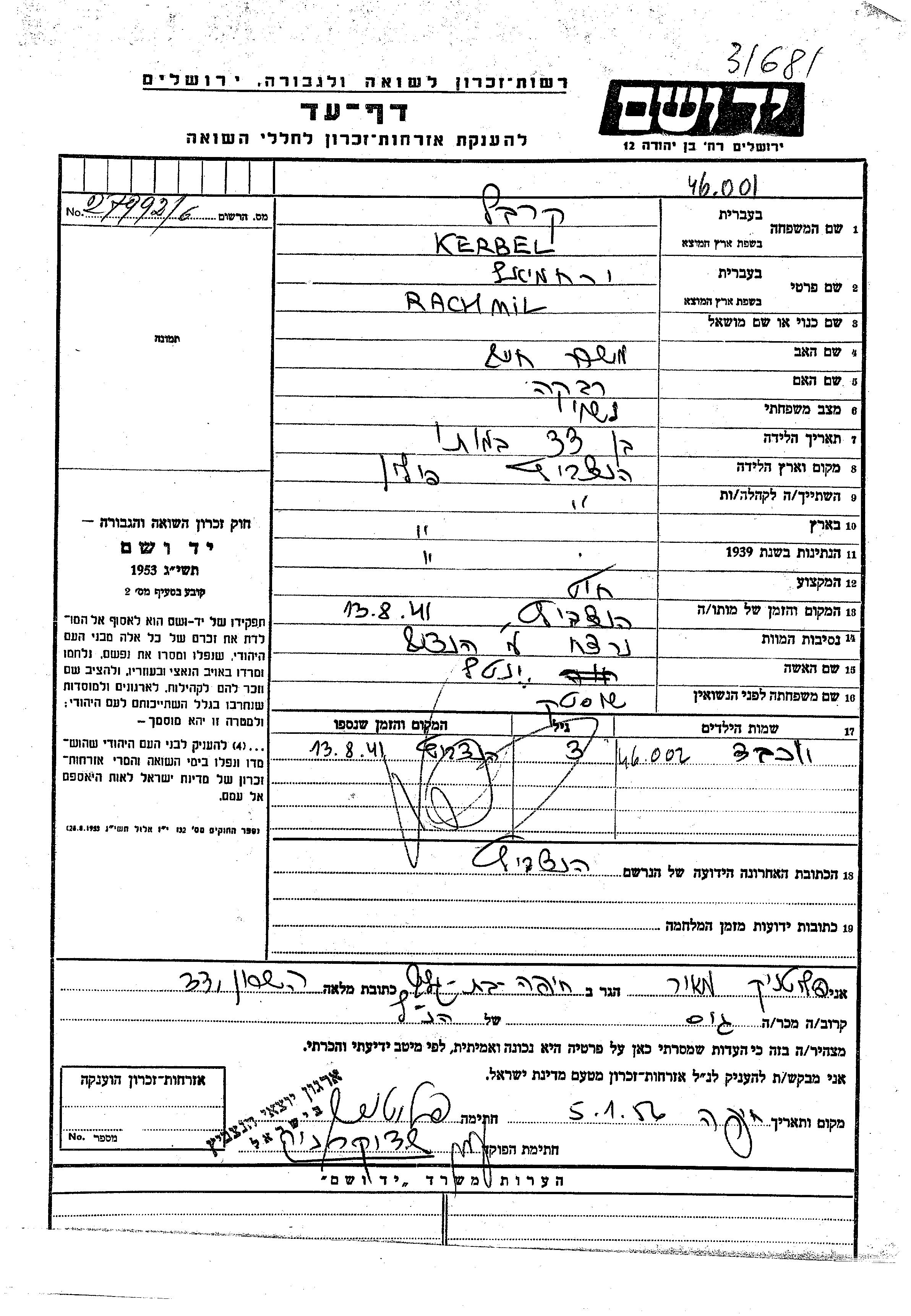 Кербель | Рахмил | Ганцевичи, Польша | Лист свидетельских показаний | |
