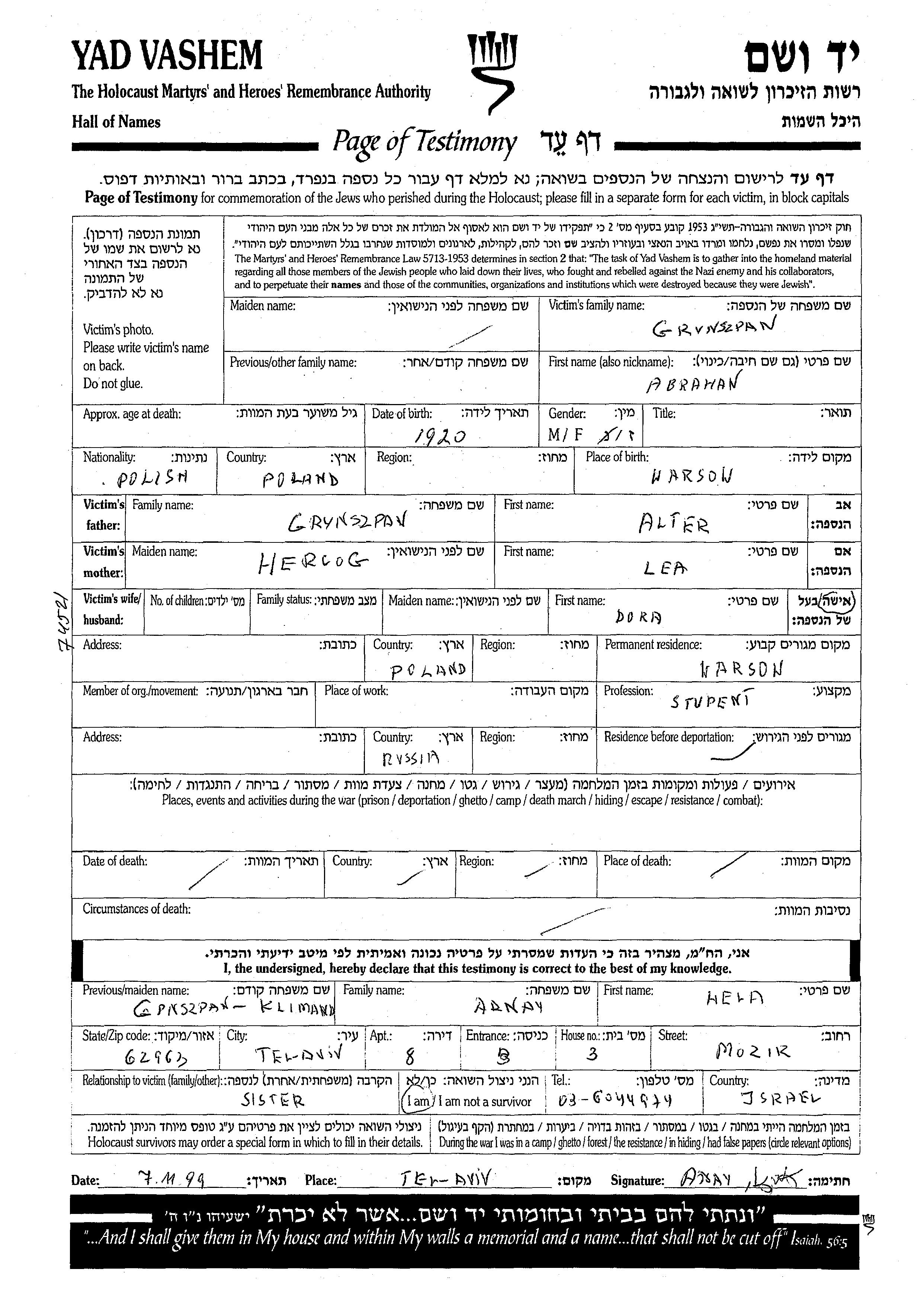 Грюншпанн Авраам 1920 Варшава, Польша Лист свидетельских показаний