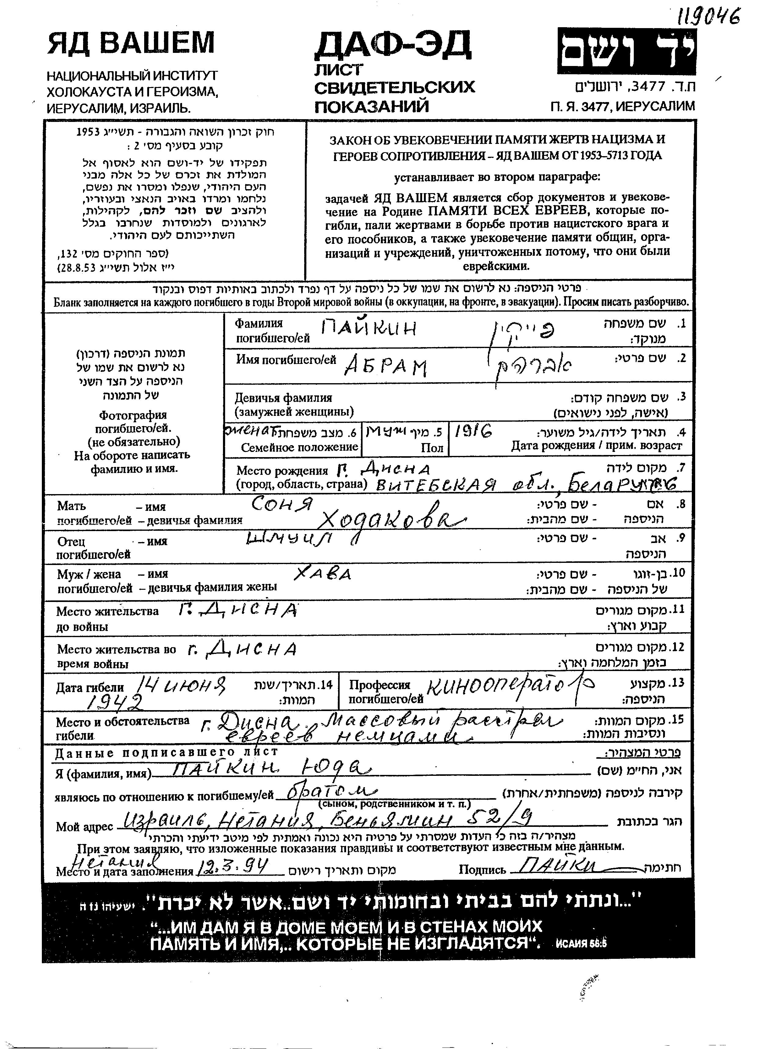 Пайкин | Абрам | 1916 | Дисна, Польша | Лист свидетельских показаний |