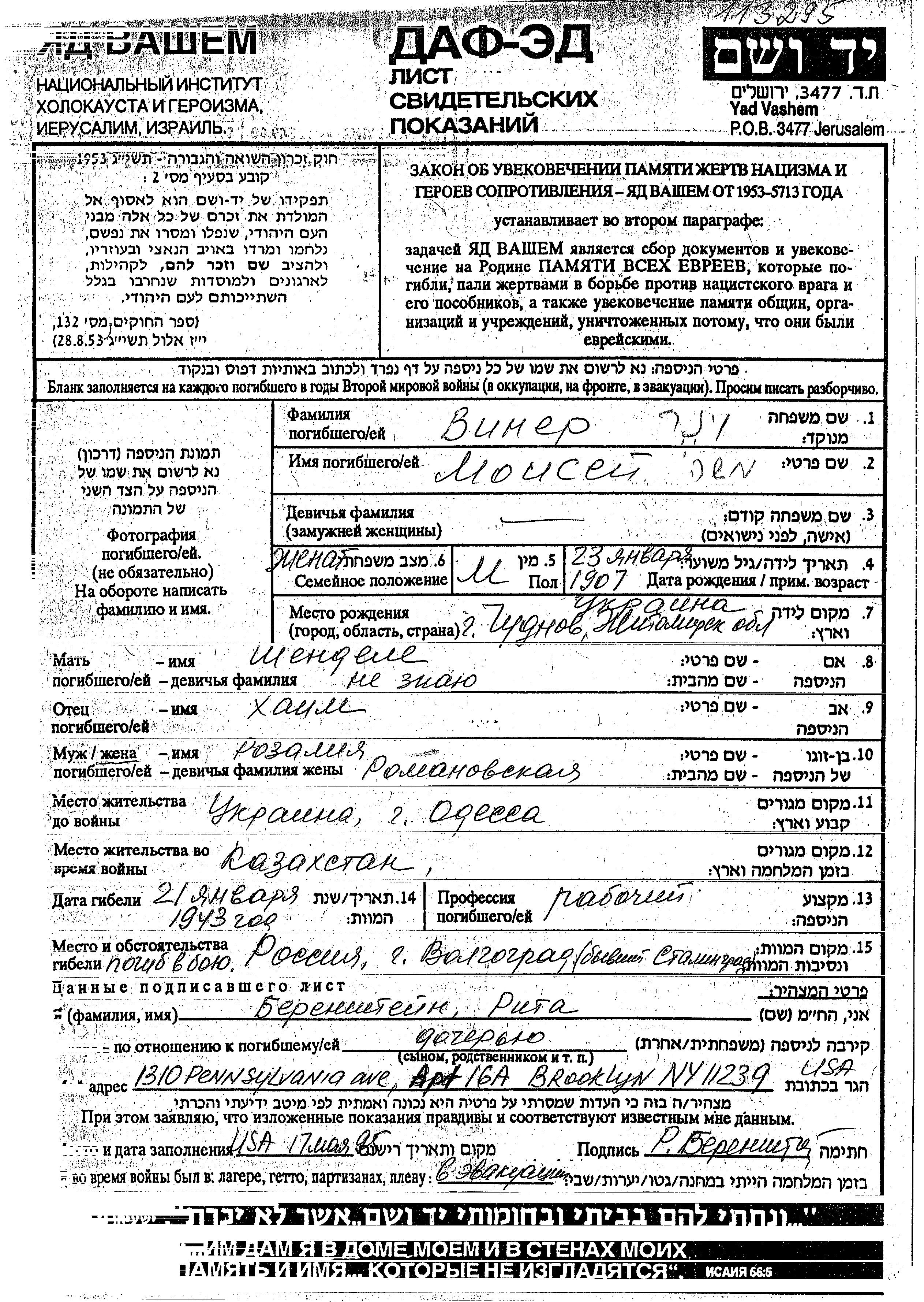 Винер Моисей 1907 Одесса, Украина (СССР) Лист свидетельских показаний