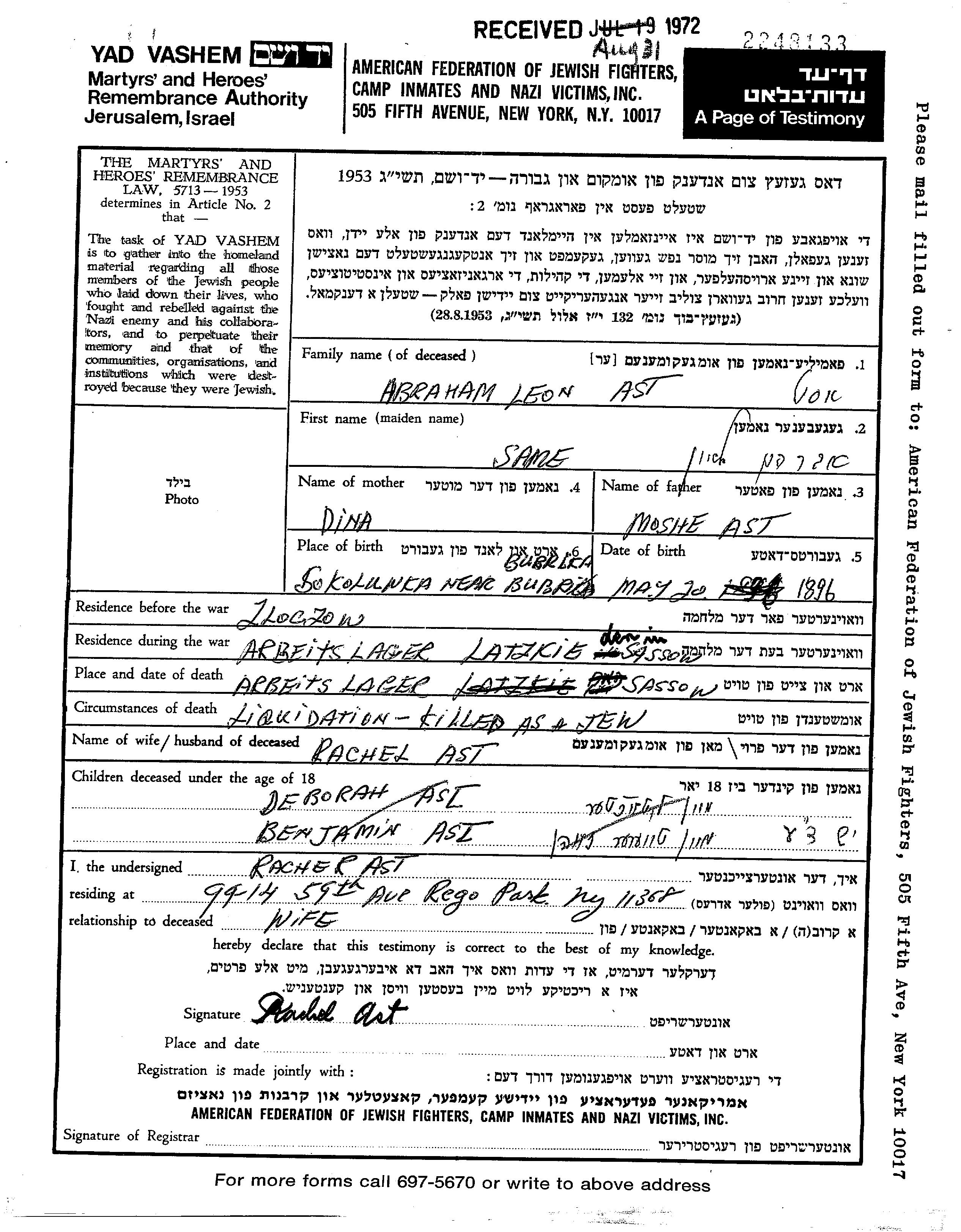 Аст Абраам Леон 1896 Злочов, Польша Лист свидетельских показаний