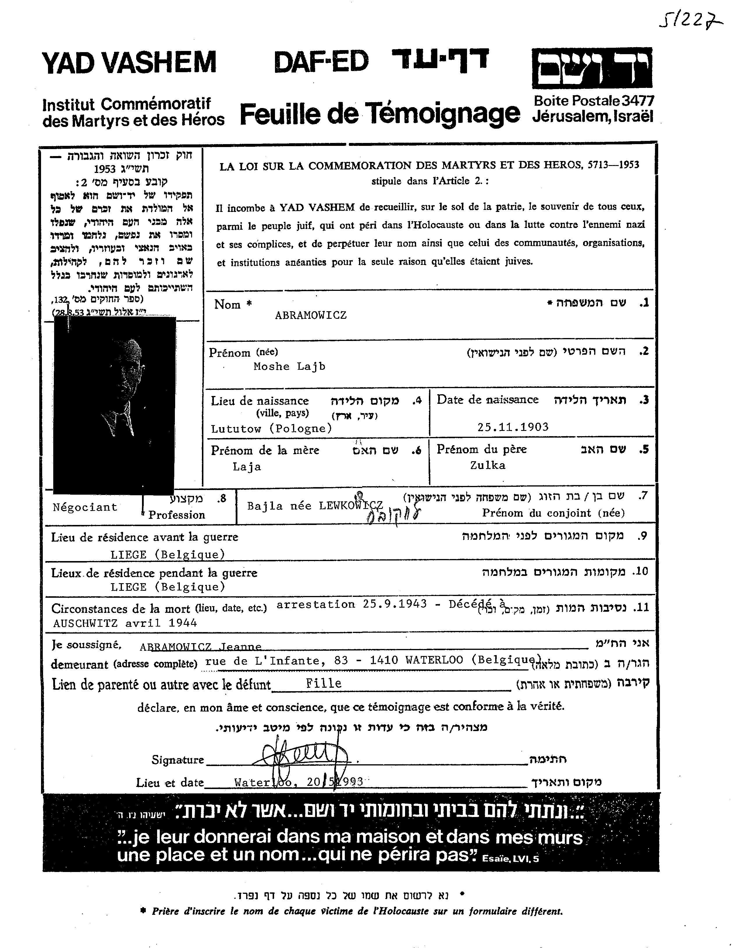 Абрамович Лайб Моше 1903 Льеж, Бельгия Лист свидетельских показаний