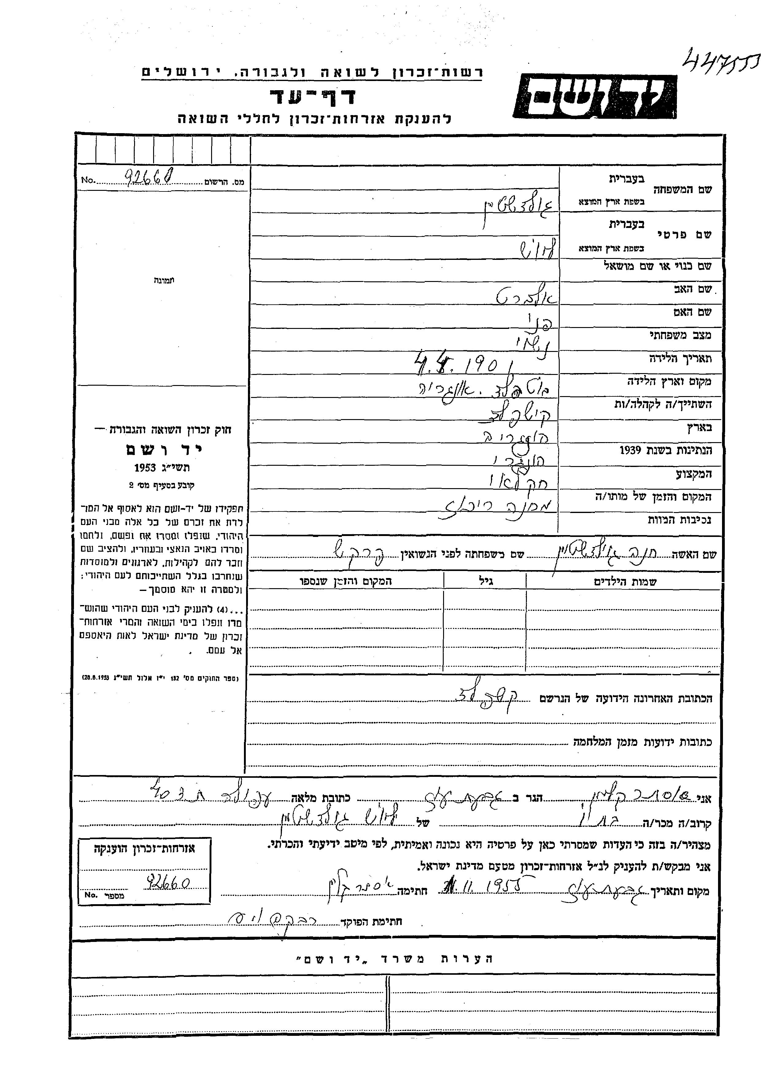 Гольдштейн | Лайош | 1901 | Кишпалад, Венгрия | Лист свидетельских показаний |