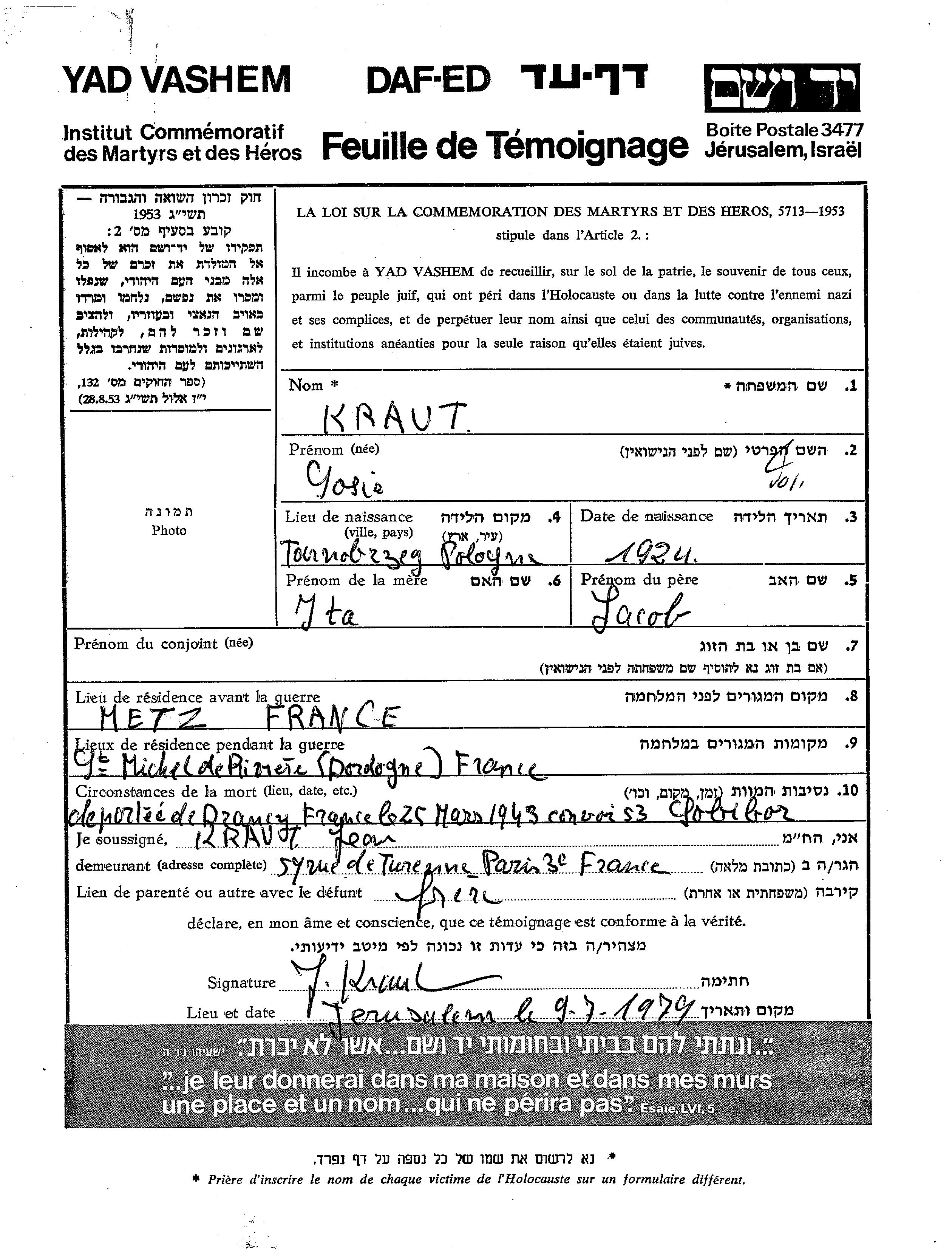 Иосеф Краут, место рождения: Тарнобжег, Польша. Место жительства до войны: Мец, Франция.
