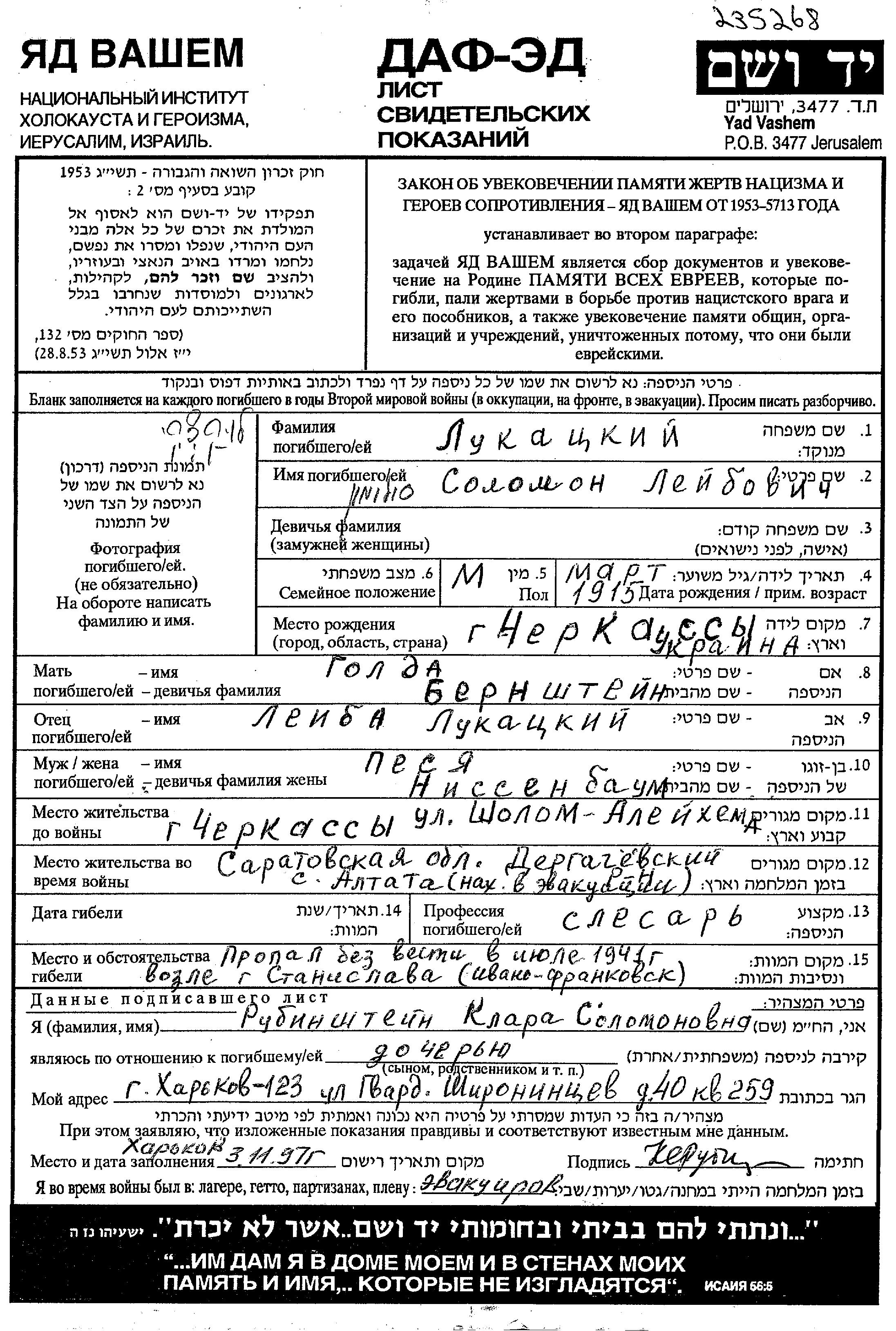 Лукацкий Соломон 1915 Черкассы, Украина (СССР) Лист свидетельских показаний