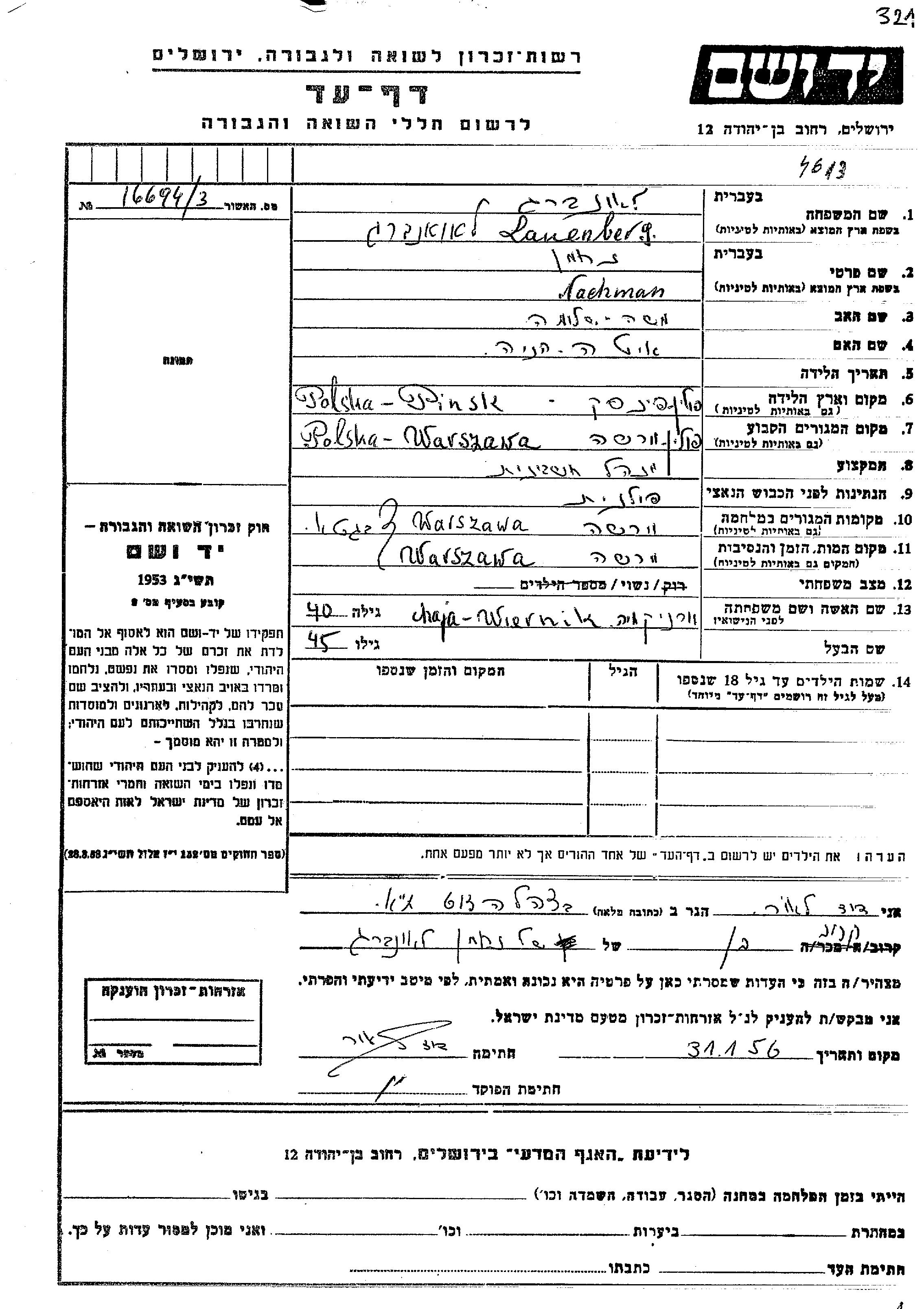 Нахман Леонберг Лауэнберг, место рождения: Пинск, Польша. Бухгалтер / счетовод. Место жительства до войны: Варшава, Польша.